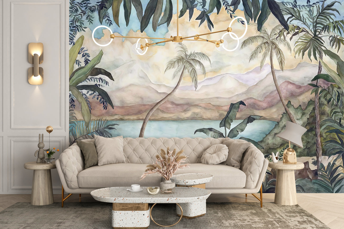 Transform any room into a serene oasis with our green pond tropical oasis wallpaper mural. Inspired by the beauty of nature, this mural feature lush greenery and tranquil waters, set against a backdrop of distant grey mountains. Its light dusky colors blend harmoniously, creating an artistic impression that captivates at first sight. Ideal for living rooms, dining areas, and bedrooms, this artistic wallpaper offers a fresh, breathy atmosphere, enhancing the ambiance of your space. Combine it with real potted plants for an even more immersive experience. As one of our bestsellers, the 'Green Pond' mural promises to be a lasting addition to your home, offering a unique space where family and guests can gather and relax. Embrace the beauty of nature with this exquisite, vegetation-based wallpaper mural.