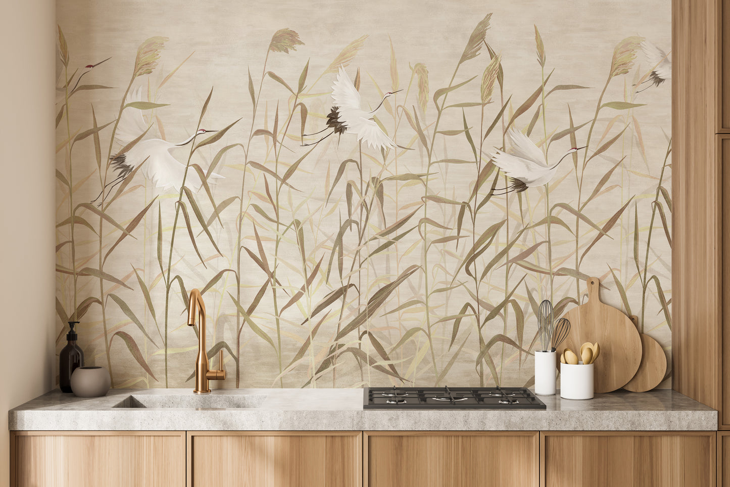 Immerse yourself in the serene ambiance of an exotic retreat with the Dusty Pink Tropical Forest Heron Birds Wallpaper. This artfully crafted mural brings a breath of tranquility into your home, showcasing a siege of graceful herons nestled amongst lush bamboo trees set against a charming dusky pink backdrop. Perfect for infusing a touch of elegance and calm into any room, from your stylish office to the cozy corners of a nursery.