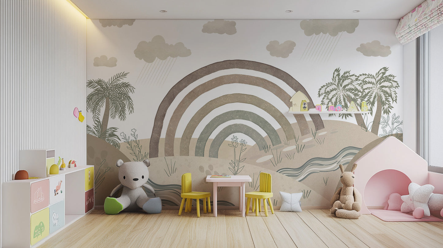Scandinavian pastel wallpaper featuring a rainbow scene