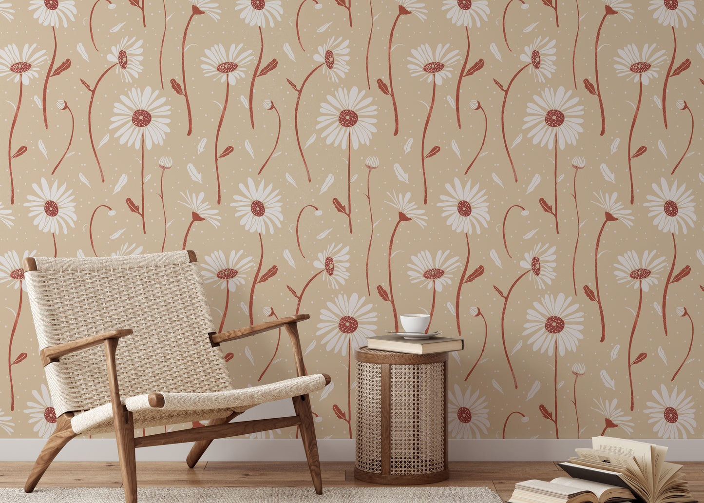 This wallpaper transports you to a rustic meadow bathed in soft sunlight. The design features a charming repeat pattern of simplified daisies with terracotta stems and white petals, rendered in a textured, slightly imperfect style. Small white dots and leaves add depth and movement, creating a subtle, airy feel. The earthy color palette of beige and terracotta is both calming and inviting, perfect for adding a touch of nature-inspired charm to any room. Ideal for those seeking a peaceful, organic aesthetic.