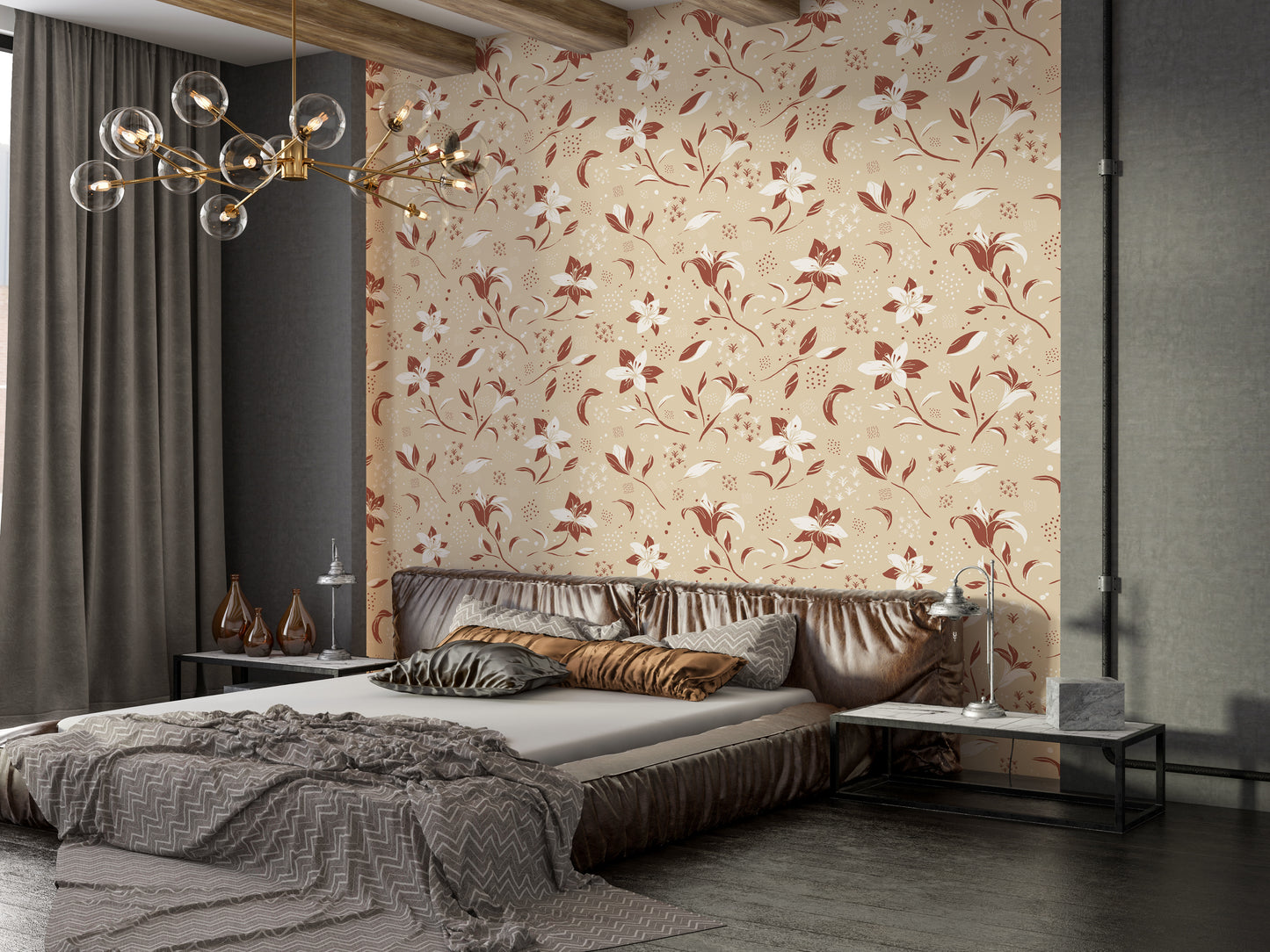 Embrace the beauty of rustic charm with this wallpaper. Its design features a captivating interplay of stylized lilies, rendered in warm terracotta and creamy off-white shades against a beige backdrop. The organic forms of the flowers are enhanced by the inclusion of abstract elements like dots and dashes, adding a touch of modern design sensibility. The overall effect is one of relaxed sophistication, perfect for spaces that crave a blend of natural elegance and artistic expression. This wallpaper effortlessly enhances any room, adding a feeling of calmness and understated luxury.