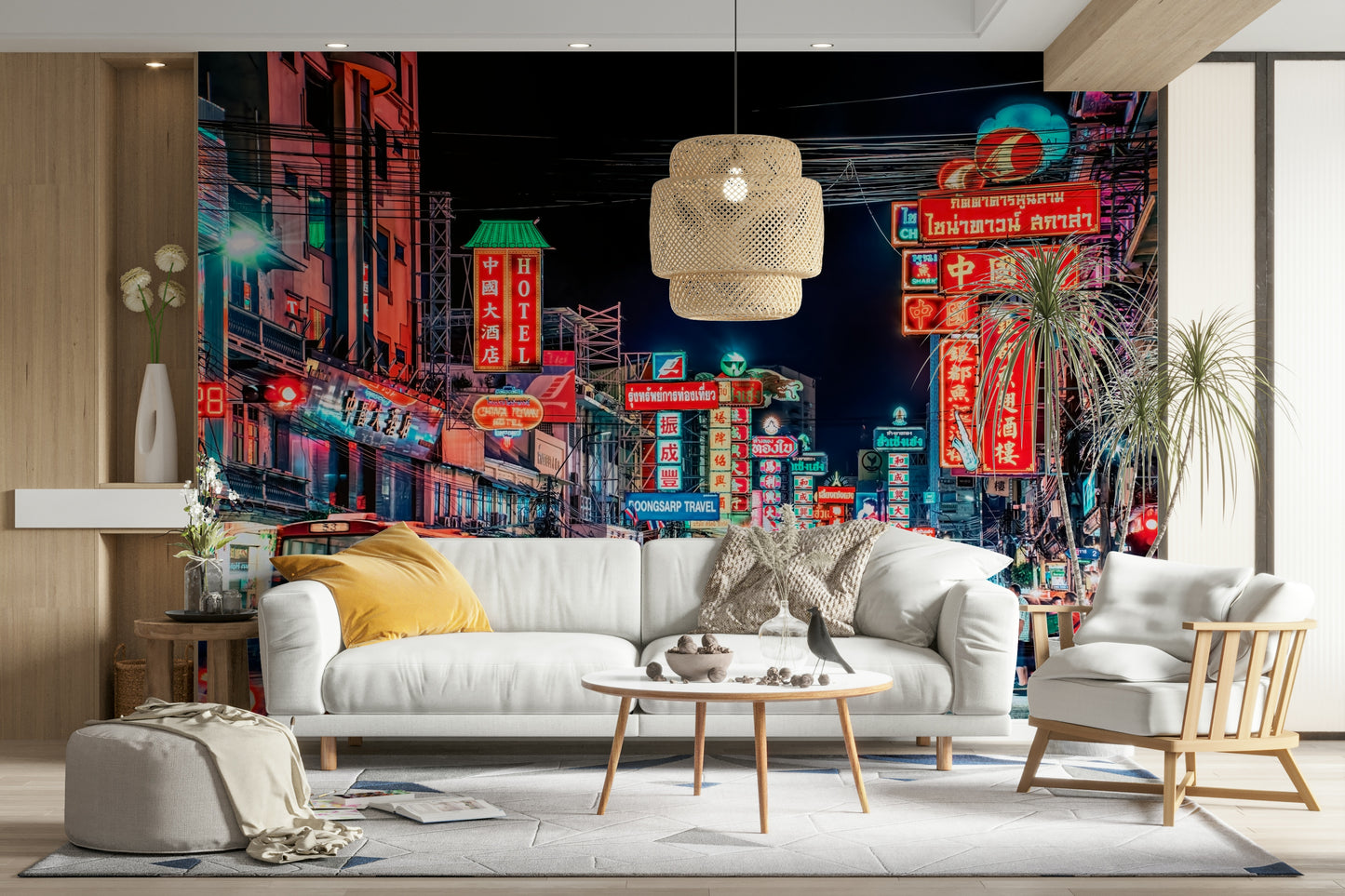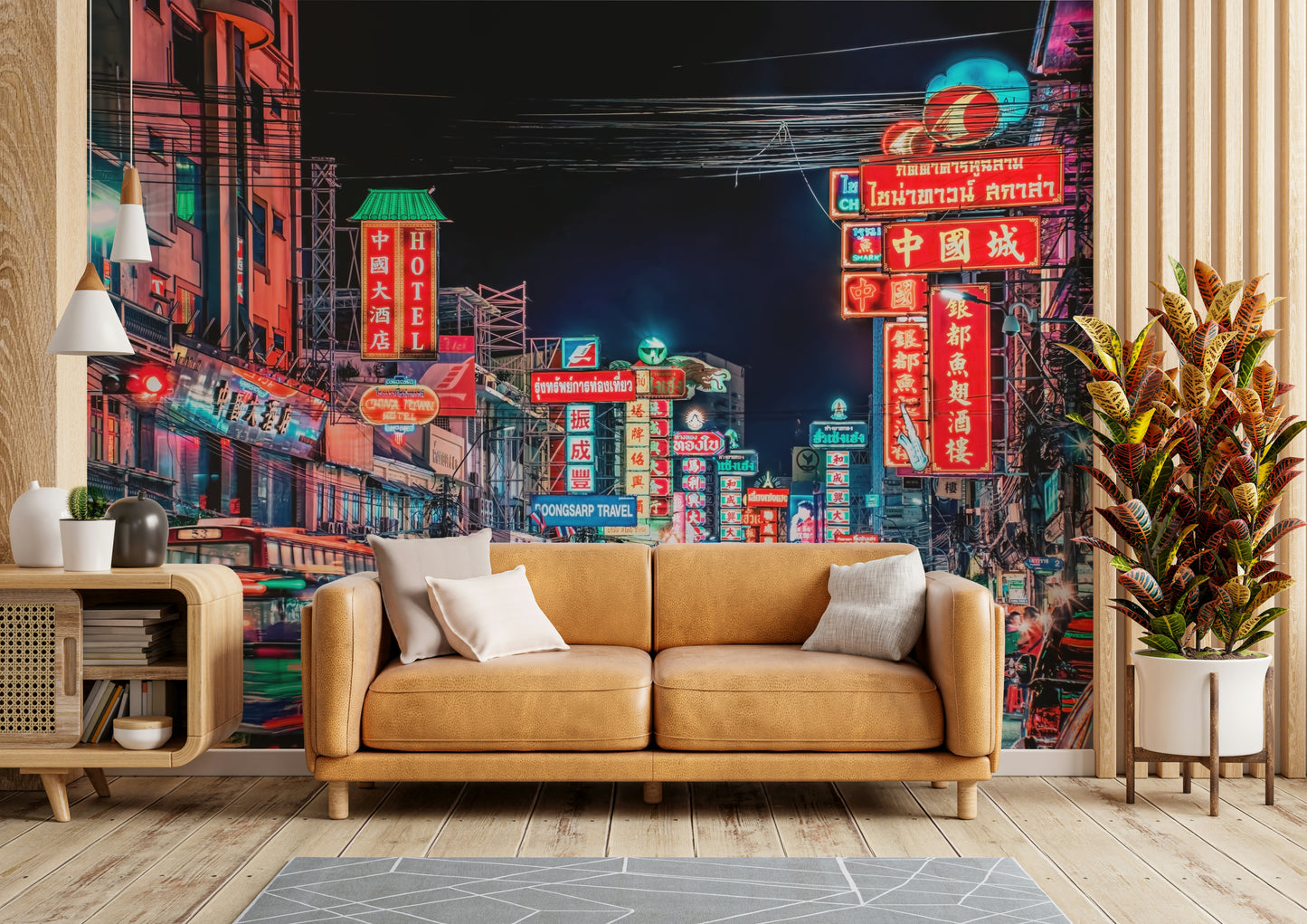 Experience the electrifying pulse of Bangkok's street life with this captivating wallpaper. The image showcases a vibrant street at night, awash in a dazzling array of neon signs in various languages, creating a kaleidoscope of color and light. Motion blur captures the energy of moving vehicles and pedestrians, adding dynamism to the scene. The rich interplay of warm and cool tones creates a mesmerizing effect, inviting viewers to immerse themselves in the city's unique atmosphere. This stunning visual is perfect for those seeking to inject a vibrant, cosmopolitan feel into their living spaces.