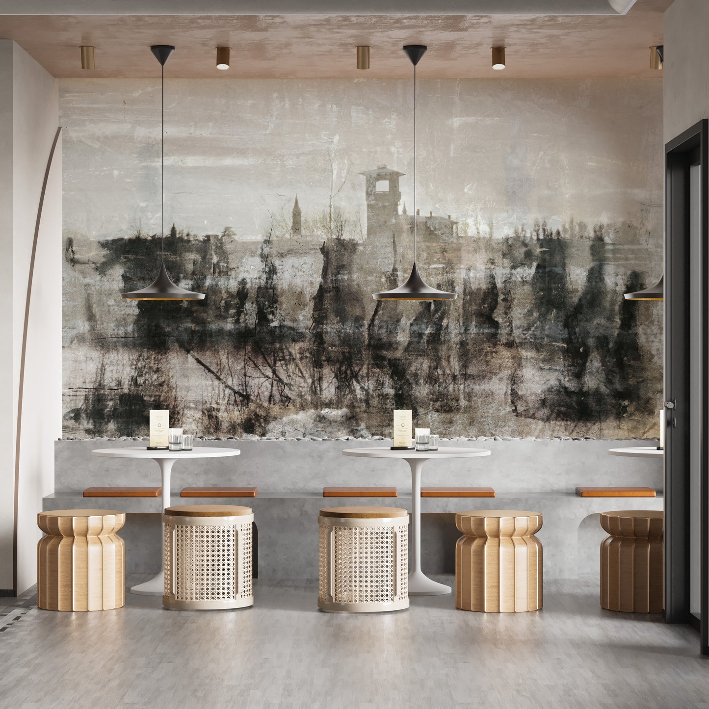Bold inked ruins mural for modern spaces