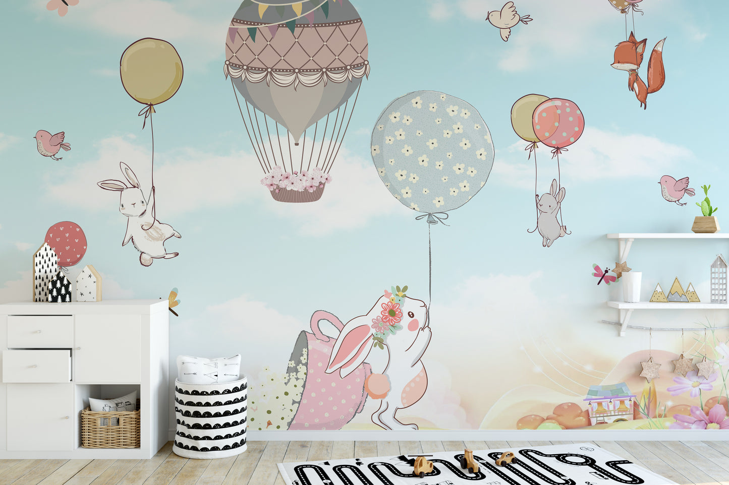 For an animated cartoon kids room mural wallpaper, envision a vibrant and playful scene that captivates the imagination. The wallpaper for walls is designed to bring a cheerful ambience to a nursery or childs room. The central theme features a whimsical landscape filled with rolling hills, lush greenery, and a clear blue sky. Playful characters, such as friendly animals and fantastical creatures, are scattered throughout the scene, engaging in fun activities like playing, dancing, and exploring. The colours are bright and lively, emphasising primary colours to stimulate visual interest and creativity in children. The animated style of the characters and scenery is charming and lighthearted, with smooth lines and a slightly exaggerated, cartoonish appearance. This wallpaper creates an engaging and joyous environment, promoting a sense of wonder and imagination in any nursery or kids room.