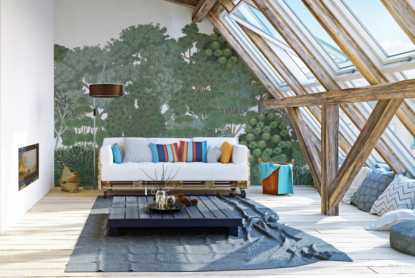 The lush green forest wallpaper mural brings the beauty of nature indoors with dense trees and vibrant foliage. The green botanical jungle wallpaper features hand-drawn details, creating a serene atmosphere. Layers of deep green leaves and tall trees enhance any room with a natural aesthetic. This dense tree canopy mural suits bedrooms, living rooms, and offices, blending well with modern and rustic interiors. The detailed nature-inspired forest wallpaper adds depth, making walls feel expansive. The rich, earthy tones and intricate botanical patterns highlight the beauty of vibrant green foliage wallpaper, offering a timeless and refreshing appeal for any space.