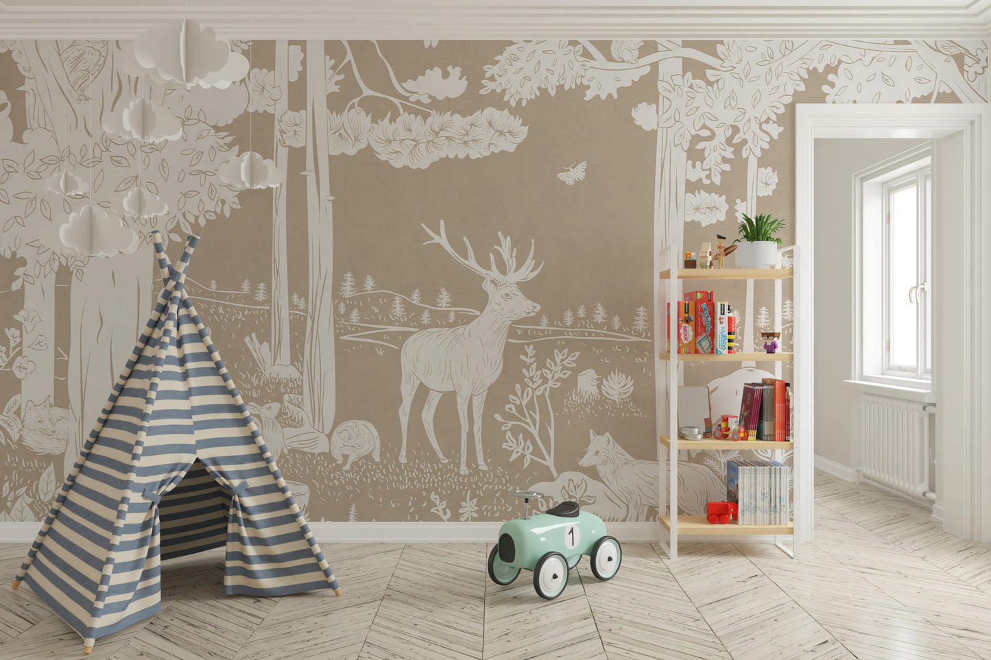 Create a peaceful haven for your little one with the monochrome forest brown wall mural. This nursery wallpaper showcases a detailed forest scene in soothing brown hues, featuring deer, birds, and other woodland creatures. The mural's soft color scheme makes it versatile, allowing it to blend seamlessly with various nursery styles and color schemes. Made from premium materials, this wall mural is designed to last and is easy to clean, making it a practical choice for parents. Invest in the Monochrome Forest Brown Wall Mural to enhance your nursery's charm. Secure yours today and get Free Delivery!
