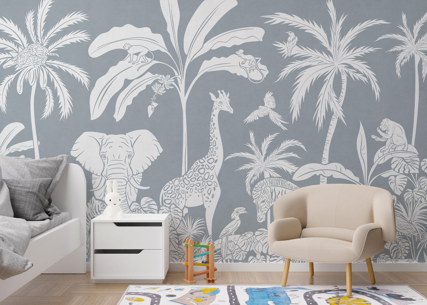 Transform your child's room with the monochrome jungle blue wall mural, an exceptional kids animal wallpaper that brings the jungle to life. This mural features a playful design with elephants, giraffes, zebras, and more, set against a soothing blue background. The intricate details of the animals and foliage create a whimsical and engaging environment, perfect for sparking your child's imagination. Made from high-quality materials, this wallpaper is durable and easy to clean, ensuring it remains vibrant and captivating for years to come. Order the Monochrome Jungle Blue Wall Mural today and let your child enjoy a wild adventure every day. Get yours now!