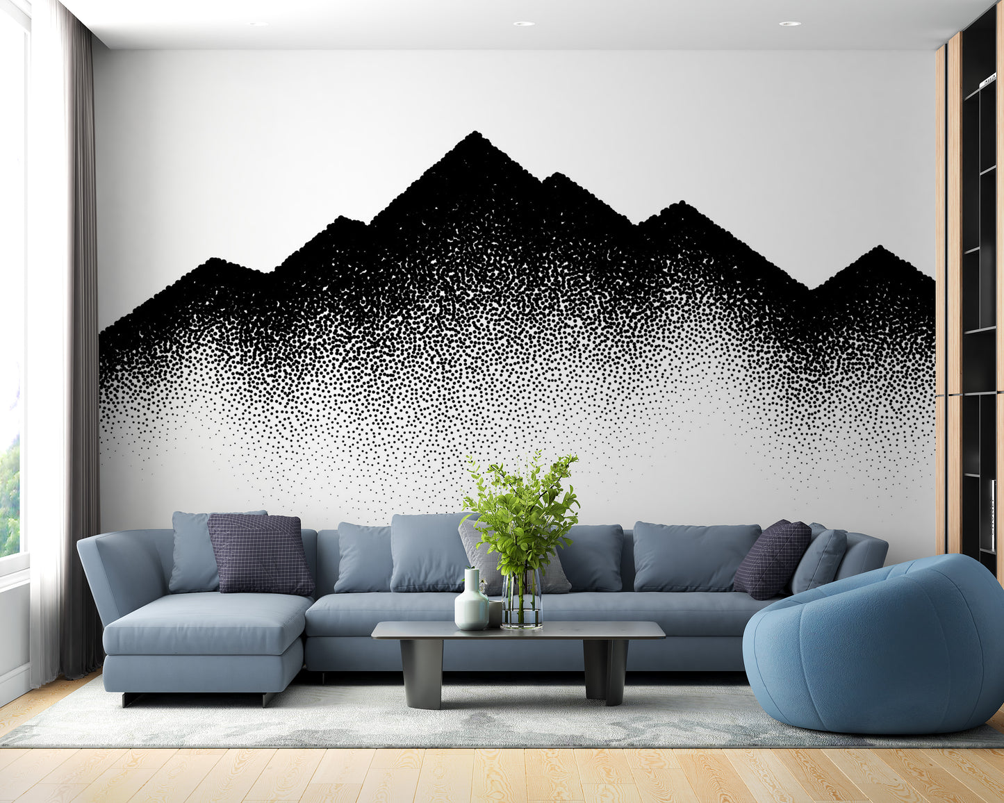 The black mountains and a wave of dots mural wallpaper is a statement piece that commands attention in any living room setting. Imagine a vast expanse of majestic peaks rising starkly against a clean backdrop, each mountain silhouette gradually dissolving into a sea of scattered dots below. This innovative design merges the raw beauty of mountain landscapes with a modern, pixelated twist, creating a dynamic visual effect that captivates and delights. Perfect for those who appreciate the grandeur of mountain wallpaper and seek a contemporary touch, this mural is an artful fusion of nature and digital aesthetics, promising to be a focal point in your living space.