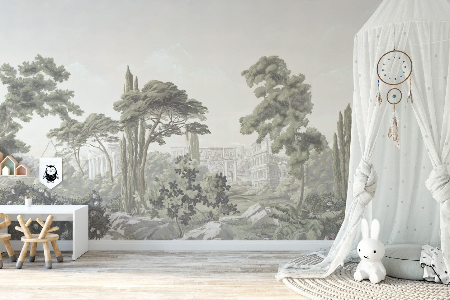 Mystic fog jungle panorama mural wallpaper transports you to a realm of enchantment and wonder. Perfectly designed for those seeking a vintage wallpaper touch to their living spaces, its ethereal blend of rich foliage, misty landscapes, and captivating hues makes it an ideal living room wallpaper. Let the timeless beauty of this panorama transform your living room into a serene escape, evoking the nostalgic charm of yesteryears while effortlessly blending with contemporary aesthetics.