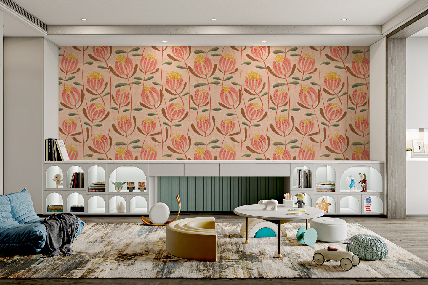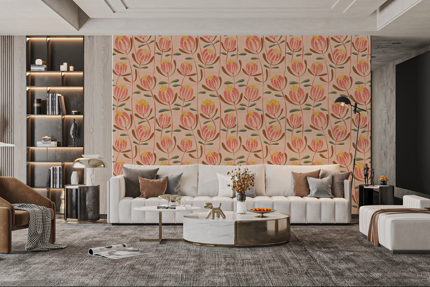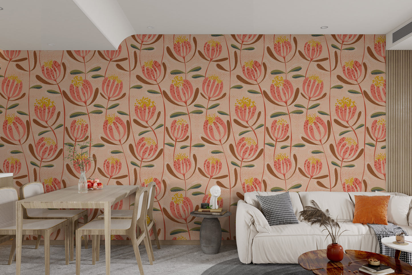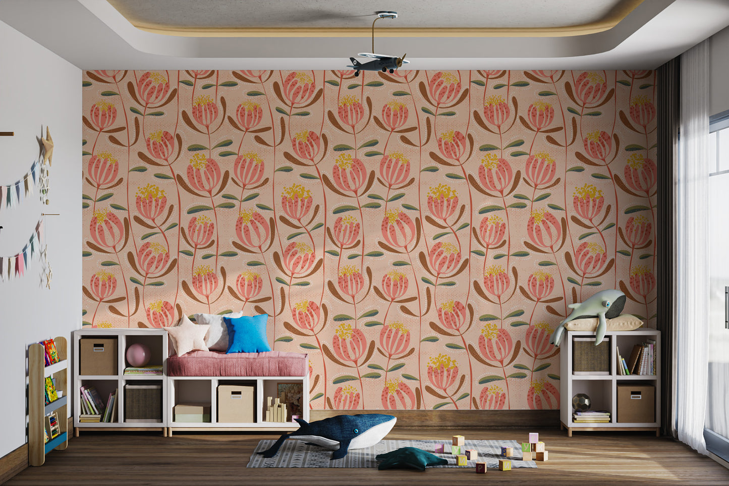 Wrap your walls in the gentle embrace of spring with this floral peach wallpaper, a pattern that captures the whimsical charm of Scandi design. Each panel is a canvas, showcasing peach-toned blooms unfurling against a soft, textured backdrop. It’s a visual melody, where nature's quiet beauty speaks volumes, creating a serene haven in your home. This print whispers stories of blooming gardens and serene afternoon walks, infusing rooms with a sense of renewal. Imagine the delicate dance of petals on a warm breeze adorning your walls—this wallpaper is a testament to timeless botanical artistry, offering a touch of serenity to every corner.