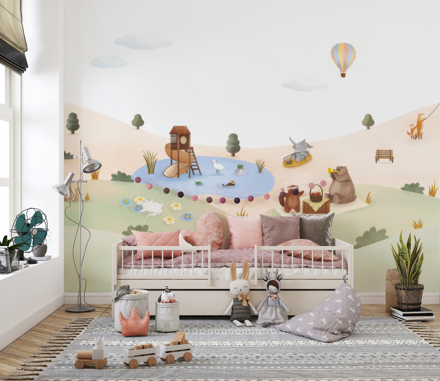 Delight little ones with the playful animals garden wall mural a vibrant scene that enlivens a kids nursery wallpaper mural. Each detail, from frolicsome creatures to serene landscapes, is crafted to inspire stories and dreams. A pond's ripple, a tree's whisper—every element harmonizes to foster a world of wonder for young minds. This piece infuses playtime with creativity, turning nurseries into havens of adventure.
