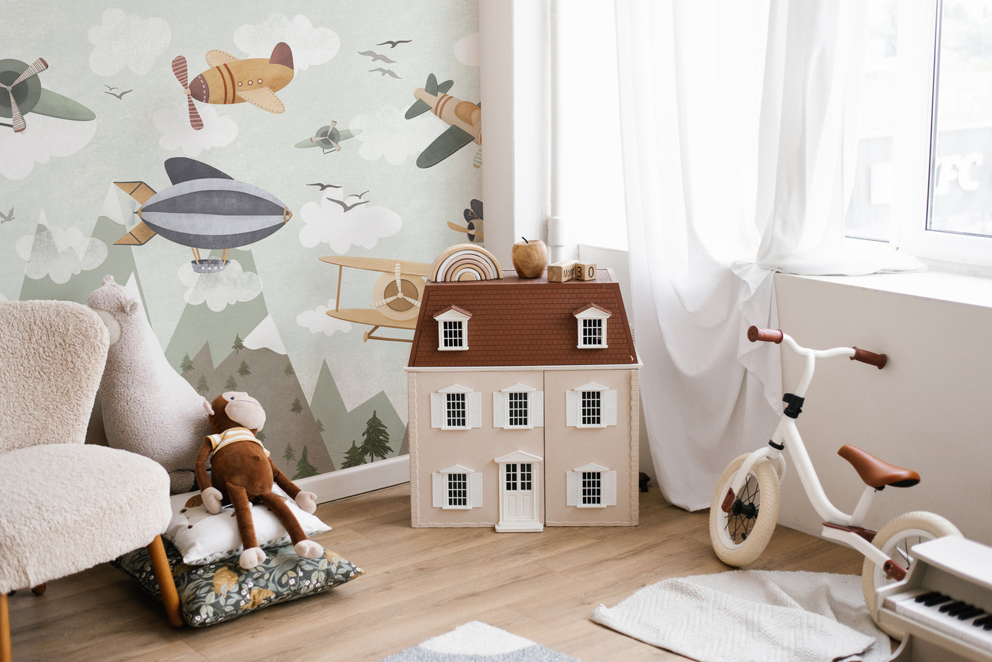 Explore new heights in your child's room with the skyward adventure wall mural. This vibrant kids mountain wallpaper brings a sense of adventure and curiosity to any room. Each peak and airplane design crafts a story that encourages young minds to dream big. Perfect for the budding aviator, this mural captivates with its mixture of whimsy and wilderness. It's more than just a wallpaper it's a backdrop for childhood adventures and a nursery turned explorer's hub.
