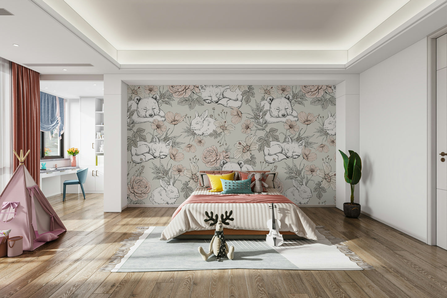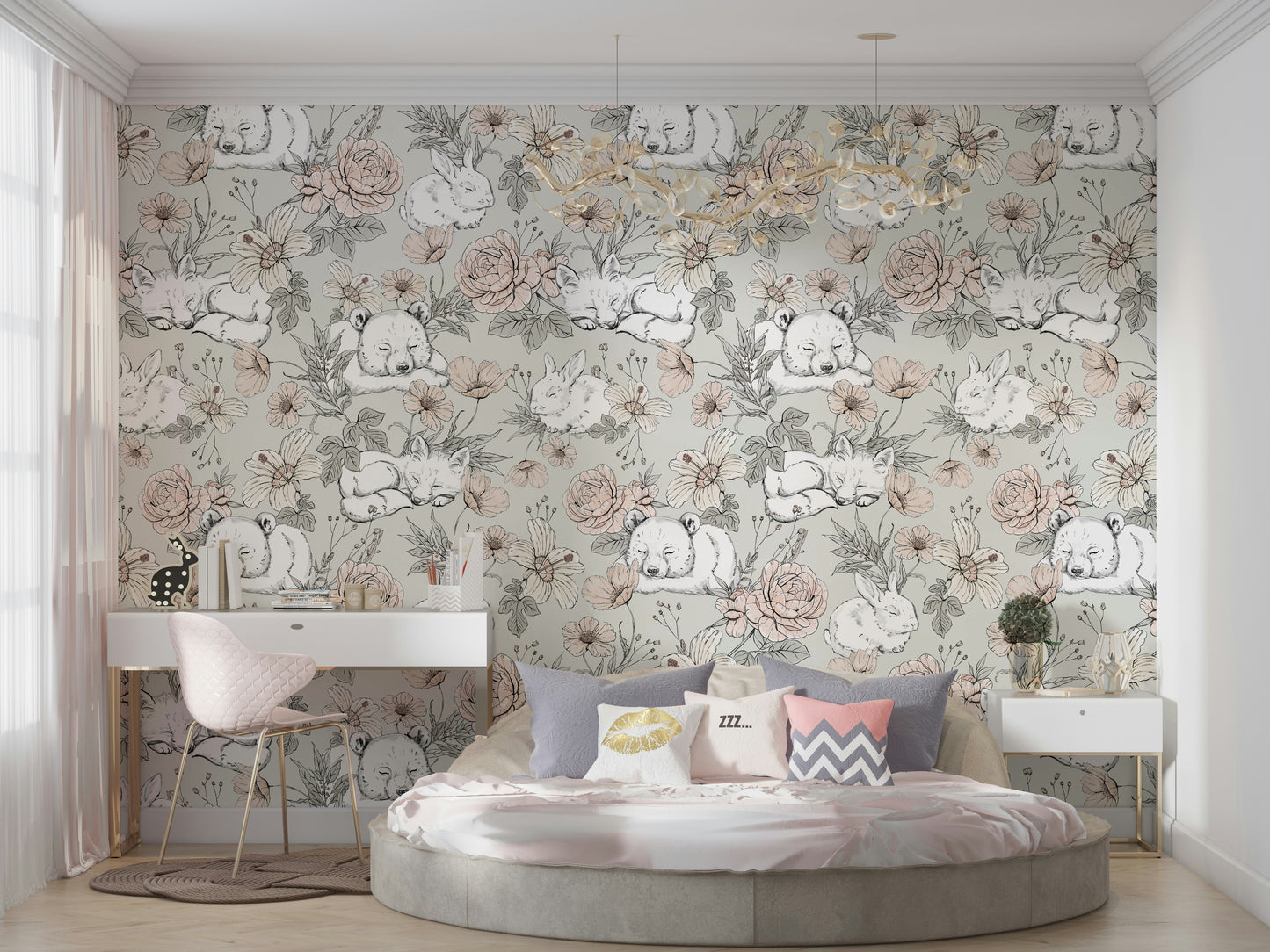 Drift into a gentle woodland dreamscape with our Sleeping Woodland – Sage Green wallpaper. Featuring softly sketched foxes, koalas, and bunnies nestled among hand-drawn florals, this design evokes peaceful forest scenes in delicate, earthy tones. The sage green backdrop adds a touch of natural calm, making it ideal for nurseries, reading corners, or toddler rooms. Every glance invites quiet wonder, helping little ones relax and feel at ease. Crafted for easy application and lasting charm, this wallpaper turns any wall into a whimsical retreat. Let your child’s space bloom with nature’s quiet magic and cuddly woodland friends.