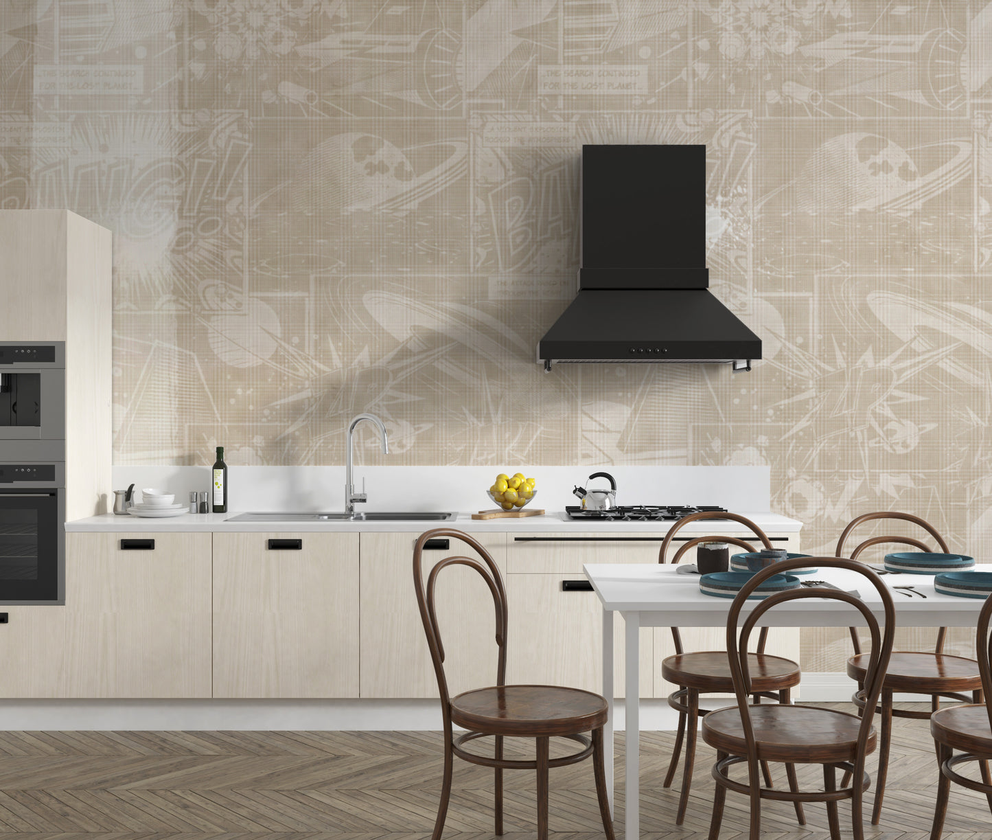 Update your space with the vintage comic space adventure wallpaper, a harmonious mix of retro space wallpaper and traditional comic art. Featuring dynamic comic strip wallpaper patterns with rockets, planets, and bold "BANG!!". Typography: this design creates a nostalgic modern look with a futuristic feel to its interiors. The beige textured wallpaper finish provides a timelessness and is suitable for children's rooms, computer gaming/media centers, or art studios. Augment your interiors with this sci-fi comic wallpaper for those who love space and vintage stuff. This monochrome comic-pattern wallpaper is a real attention-getter!
