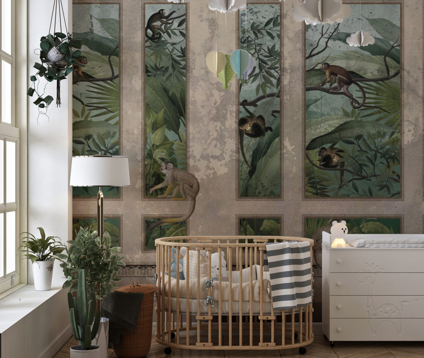 A vintage jungle monkey mural is all about what blueprint: a neat combination of the aesthetics of tropical rainforest wallpaper and antique botanical wallpaper. With monkeys at play in a thick forest of green, this monkey jungle mural adds exotic charm to any interior. The vintage effect of tropical wall decor enhances its classic aesthetic, making it perfect for living rooms, bedrooms, or creative spaces. Based on Victorian jungle murals, this luxury jungle wallpaper brings the beauty of nature indoors. This wildlife scenery wallpaper will elevate your decor; easy to install and ever-in-style. Order now and embrace decorative jungle wall art!