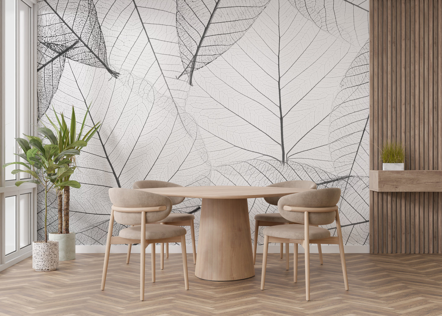 Create a striking and sophisticated statement in your dining room with this black and white large vein leaves mural wallpaper. Designed to bring a touch of natures elegance into your home, this wallpaper features an intricate pattern of leaves, each detailed with prominent, large veins that add depth and character to the design. The monochromatic colour scheme offers a classic, timeless look, ensuring it complements various interior styles. This leaves wallpaperis not just a decor element but a conversation starter, making it ideal for those who appreciate the beauty of nature in a refined, artistic form. Perfect for creating a serene and stylish atmosphere in your dining area, this wallpaper is a fusion of natural beauty and contemporary design.