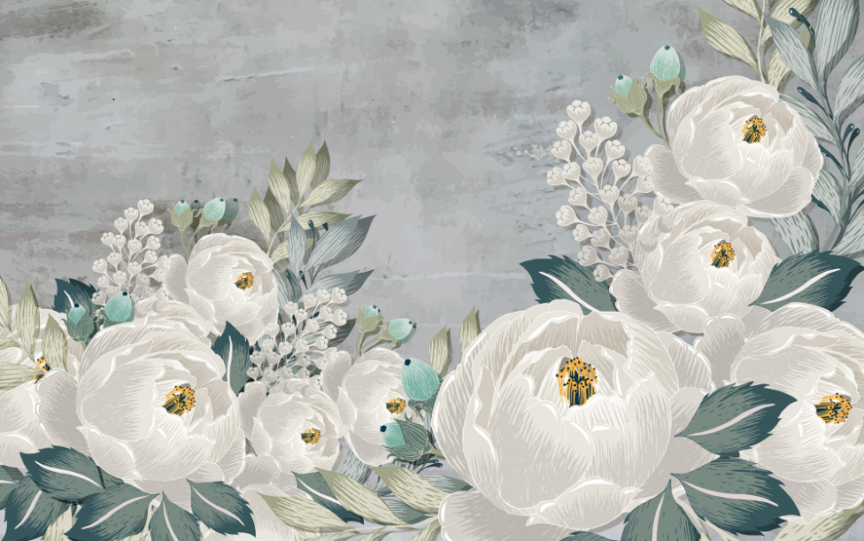 Drawn gray peonies on gray grunge wallpaper