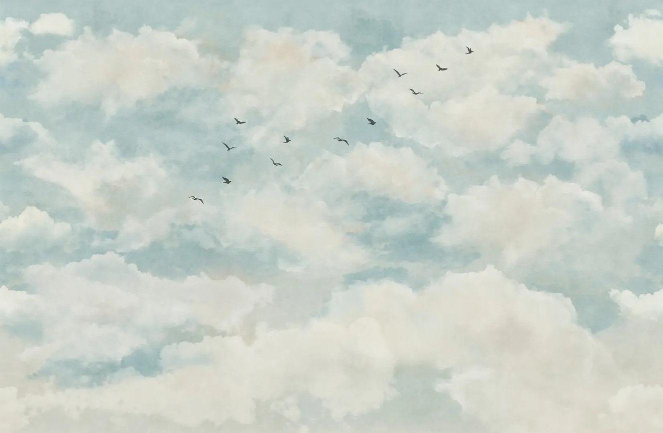 This cloud wall mural, known as a sky cloudscape, shows beautiful cloud patterns, from soft white clouds against blue skies to dramatic stormy scenes. This theme gives your walls a natural, airy look so they can be used with many different types of furniture.