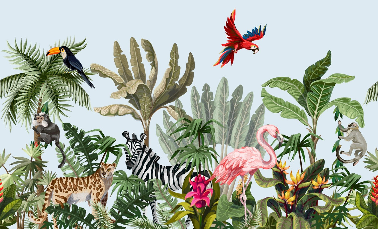 The tropical theme reminds us of mangroves, unique biodiversity, moist weather, and scenic beauty. This theme is not always bright and green; instead, it can be pastelled with softer hues. It depends where exactly you want to put it. The right fitment could be into an adjoining dressing room and closet, shared with the bedroom. This type of jungle wallpaper is customizable and can be utilized according to the room arrangement.
