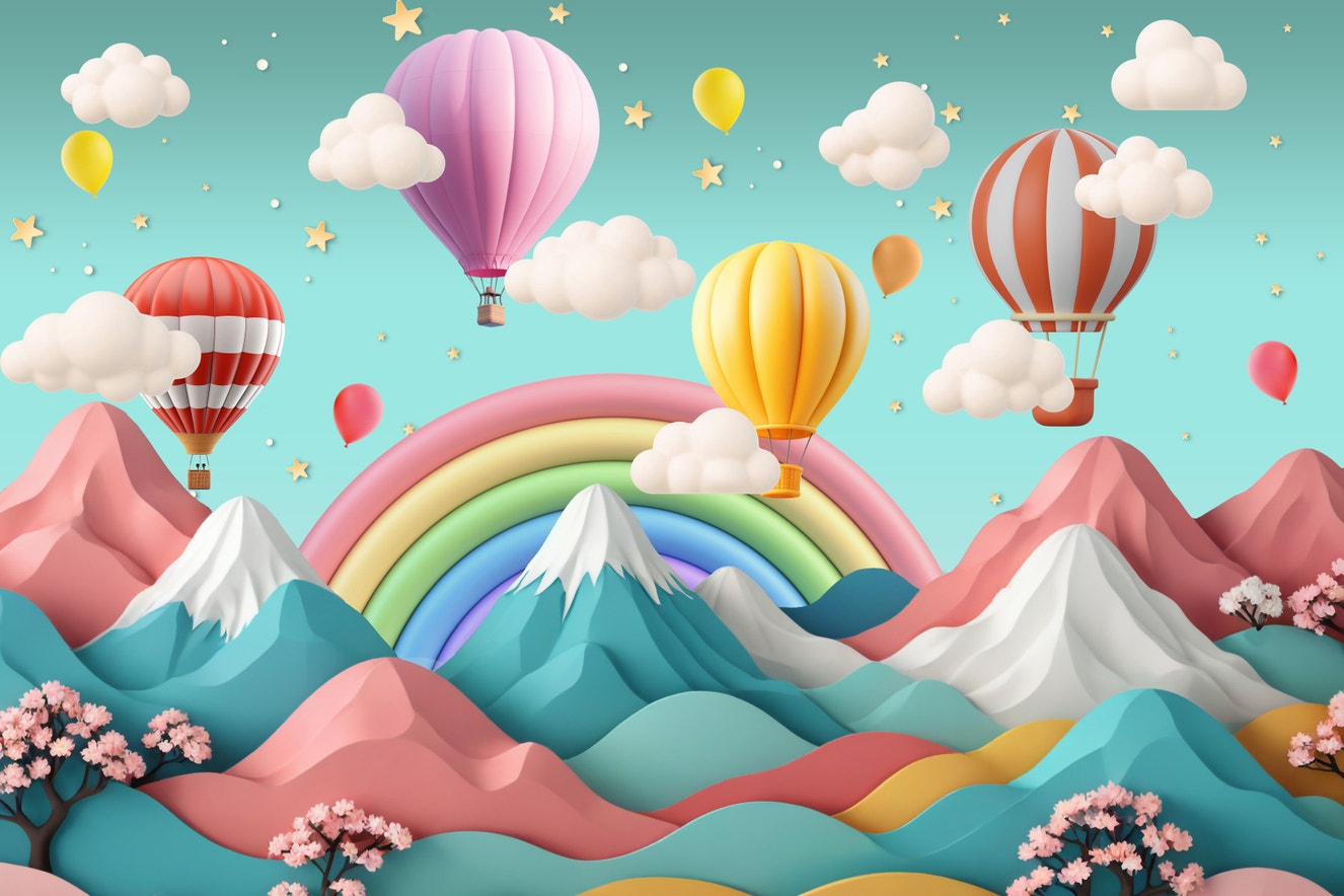 Rainbow balloon background murals have lots of different coloured balloons that make any room feel better right away. This bright style is great for playrooms and kids' rooms because it makes them feel happy and active.