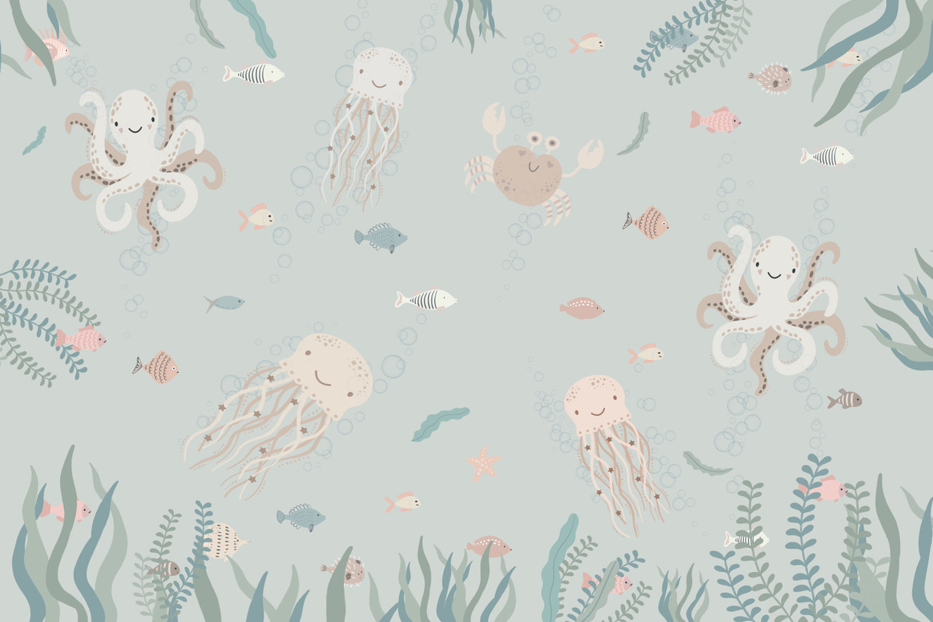 Under-the-sea wallpaper will spark your child's creativity. This design is both fun and educational. It includes friendly sea creatures, like octopuses, that make the surroundings exciting and fun. It's great for kids' bedrooms because it encourages creativity and makes the place fun.