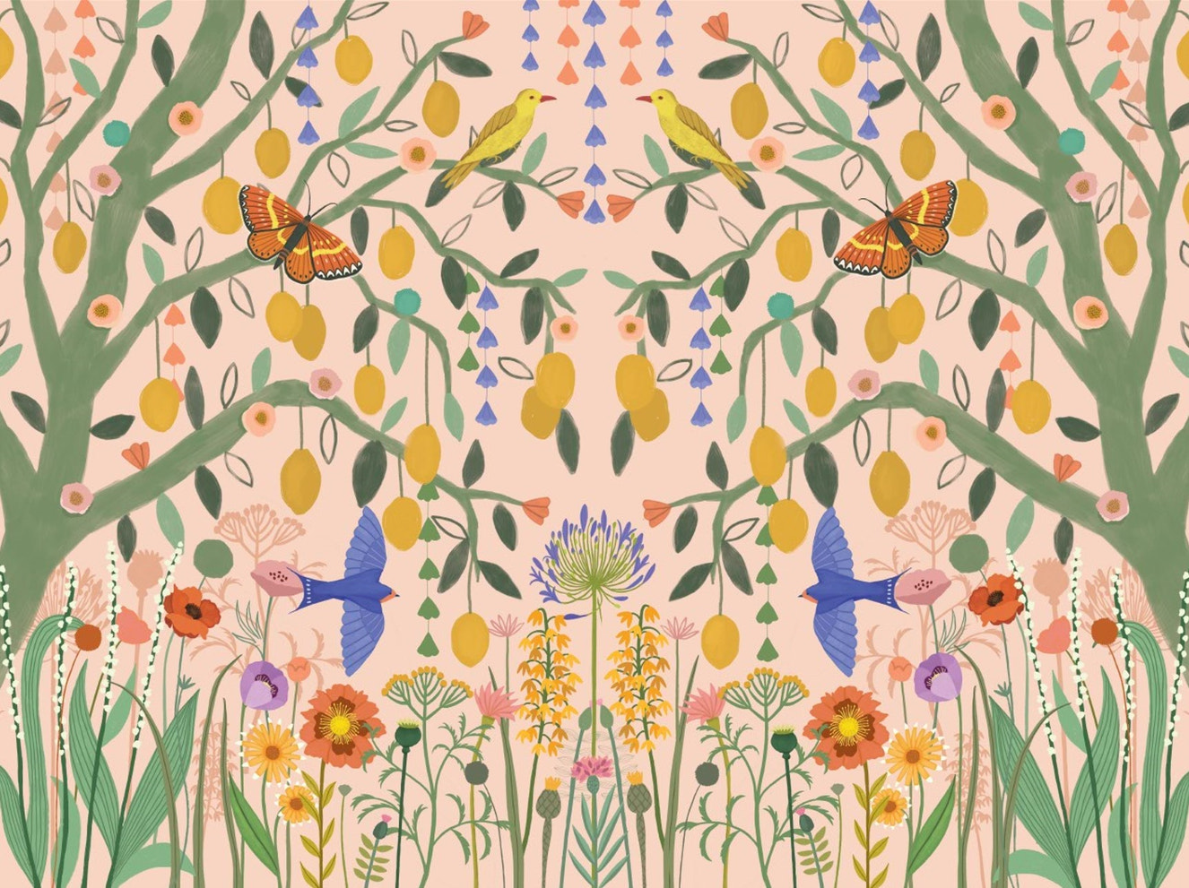 Orange wallpaper accommodates a full palette of colors, but among them, contrasting ones are the most recommended, especially navy blue, teal and forest green for a daring look. To be on the safe side and also create a subtler palette, you can even combine peach wallpaper or terracotta wallpaper with warm neutrals like beige, cream, and natural wood tones. Grey and charcoal also nicely define vivacious tangerine wallpaper patterns and are perfect in that respect.