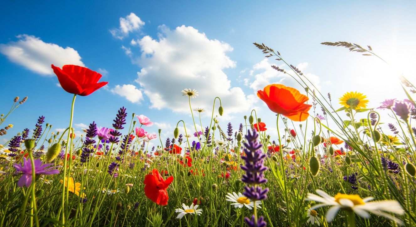 For a peaceful scene by a lake, add poppies in bloom. This theme makes me think of a calm, natural place that would be great for relaxing.