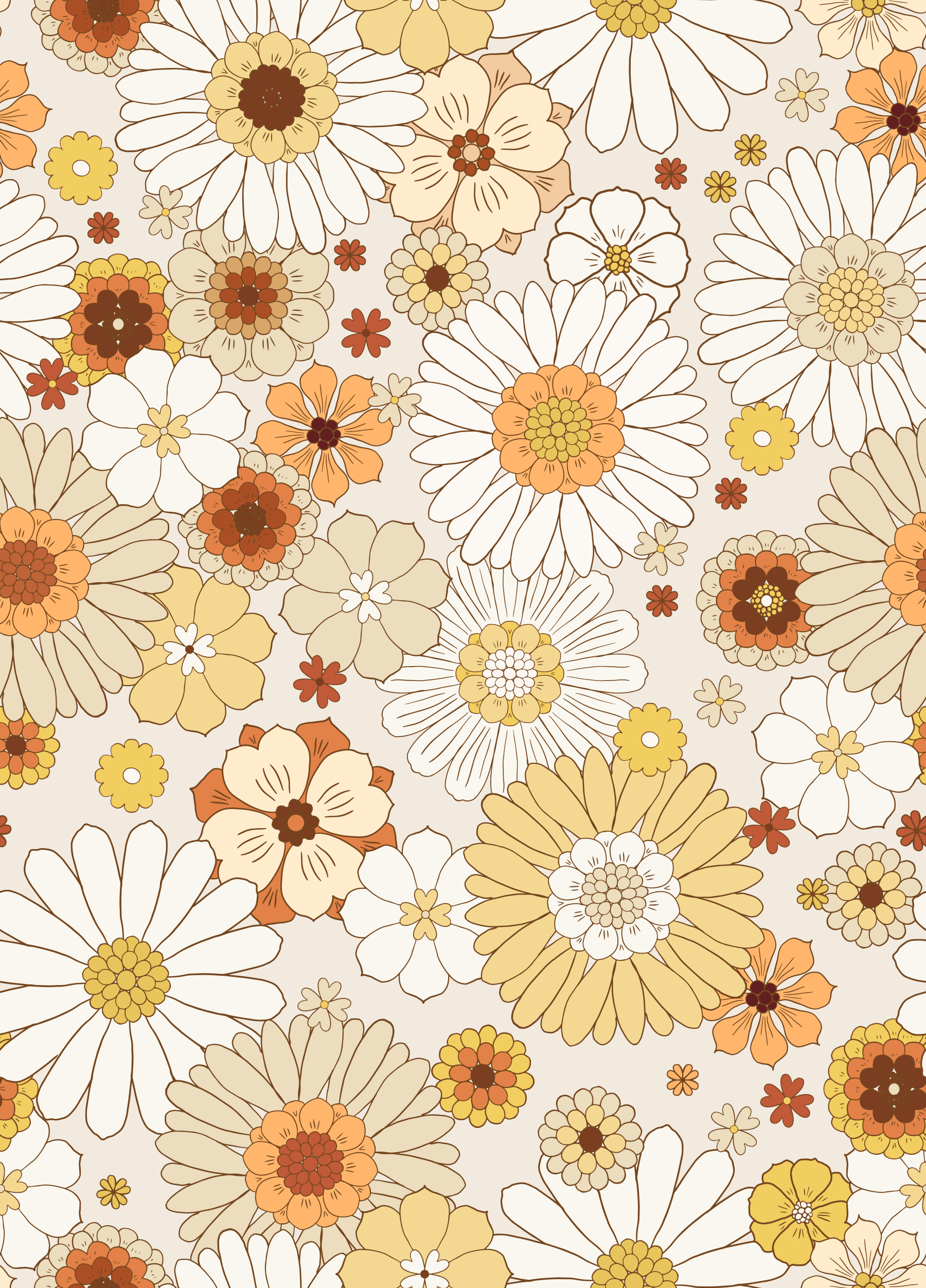 Bring a touch of 70s music festival vintage charm to your space with this floral wallpaper for walls. A seamless pattern of daisies and other blooms in a palette of sunny yellows, warm browns, creamy whites, and oranges graces a soft beige background. The oversized floral design is sure to make a statement. This wallpaper works beautifully in a bedroom, living room, or hallway. It creates a cosy and nostalgic ambience that complements vintage and retro interiors. It also suits eclectic and bohemian styles.