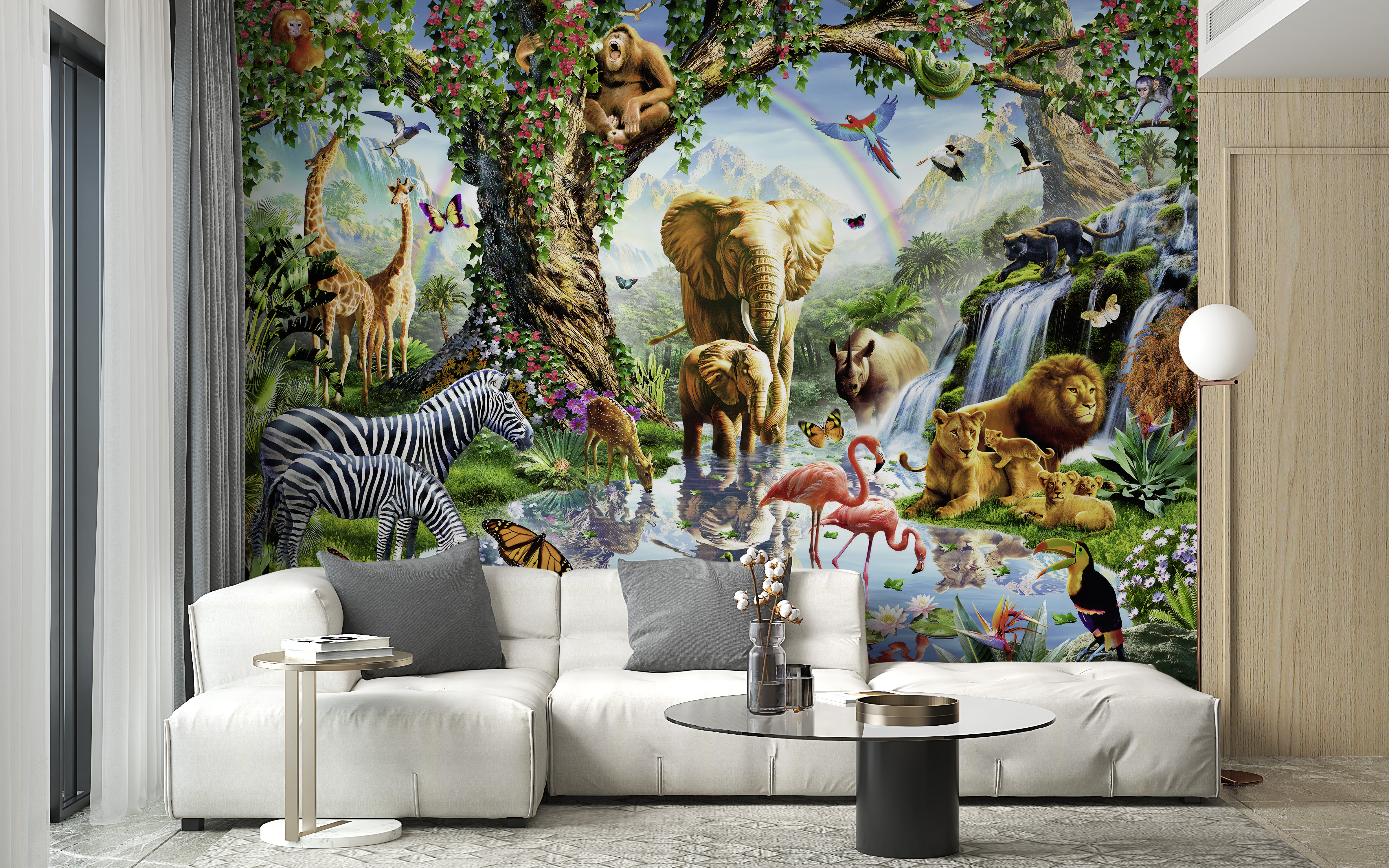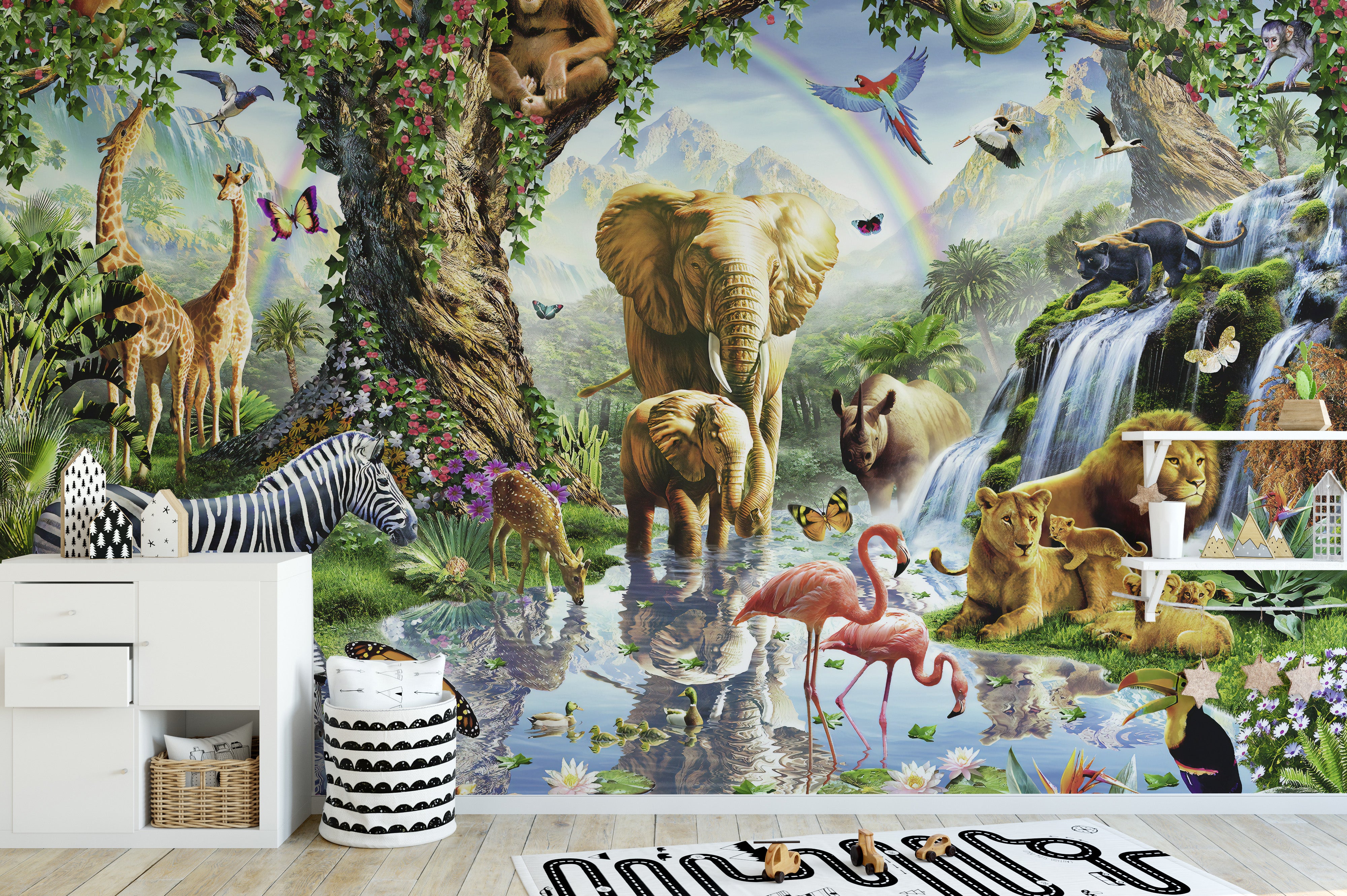 Bring the vibrant and lively spirit of the jungle into your kid's room with the colourful jungle wildlife parade mural wallpaper. With its stunning depiction of wild animals in their natural habitat, this wallpaper is more than just a design choice it's a work of art. The use of bold and vivid colours creates an immersive experience that stimulates your child's imagination, making them feel like they're exploring the jungle alongside these majestic creatures. Let the wild life wallpaper inspire your child's sense of wonder and adventure, and add a touch of playful elegance to their living space with this beautiful and creative colorful wallpaper.