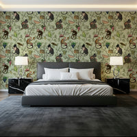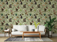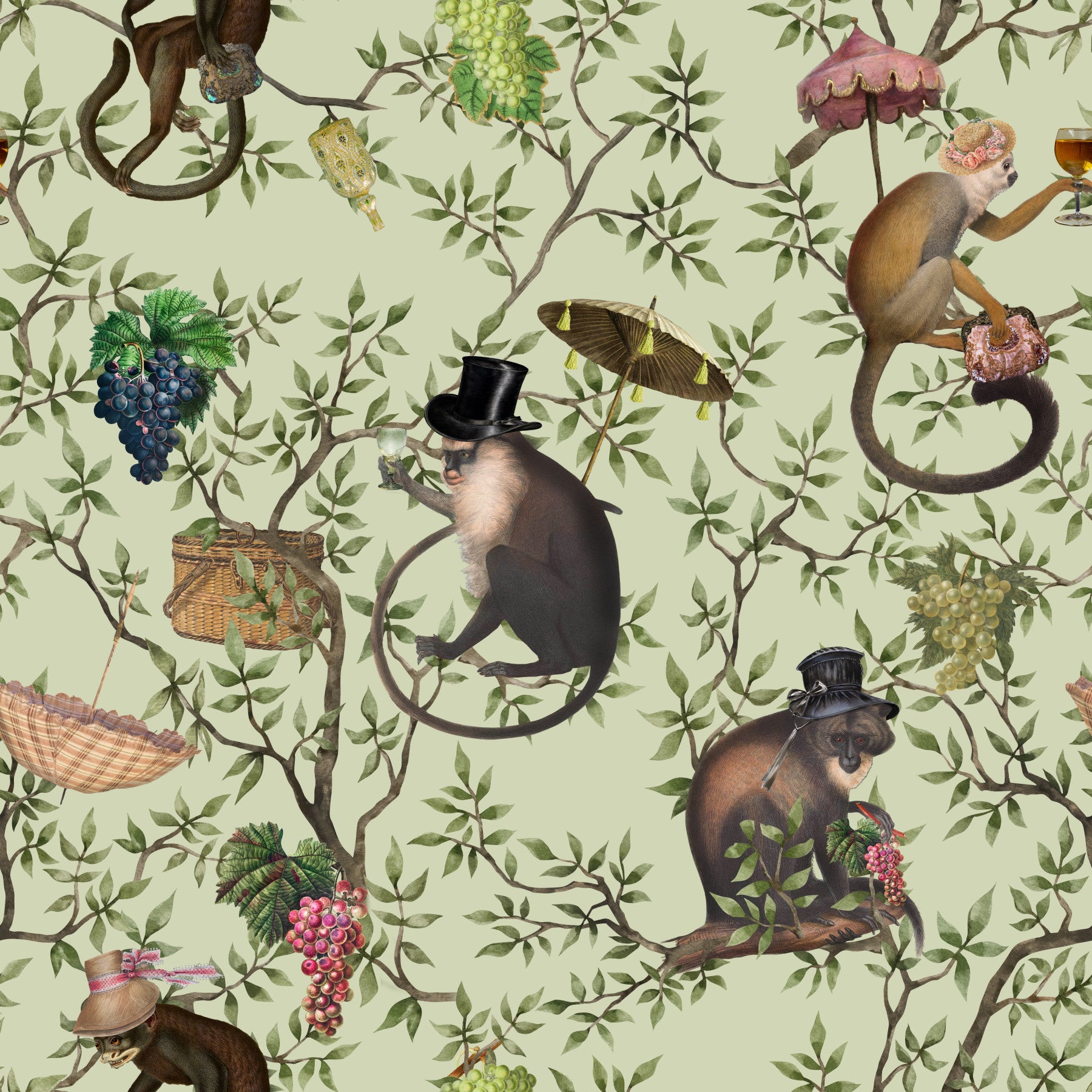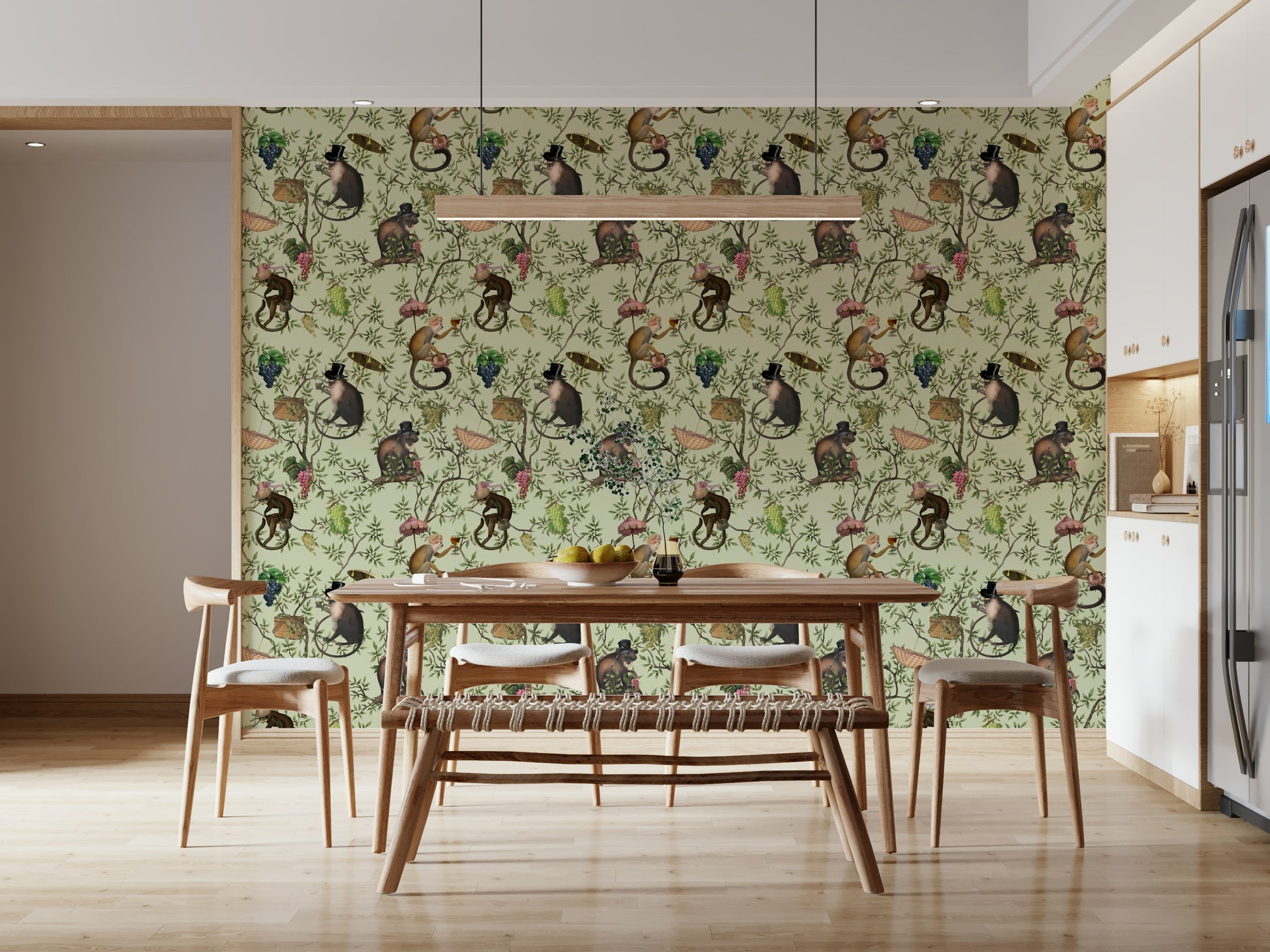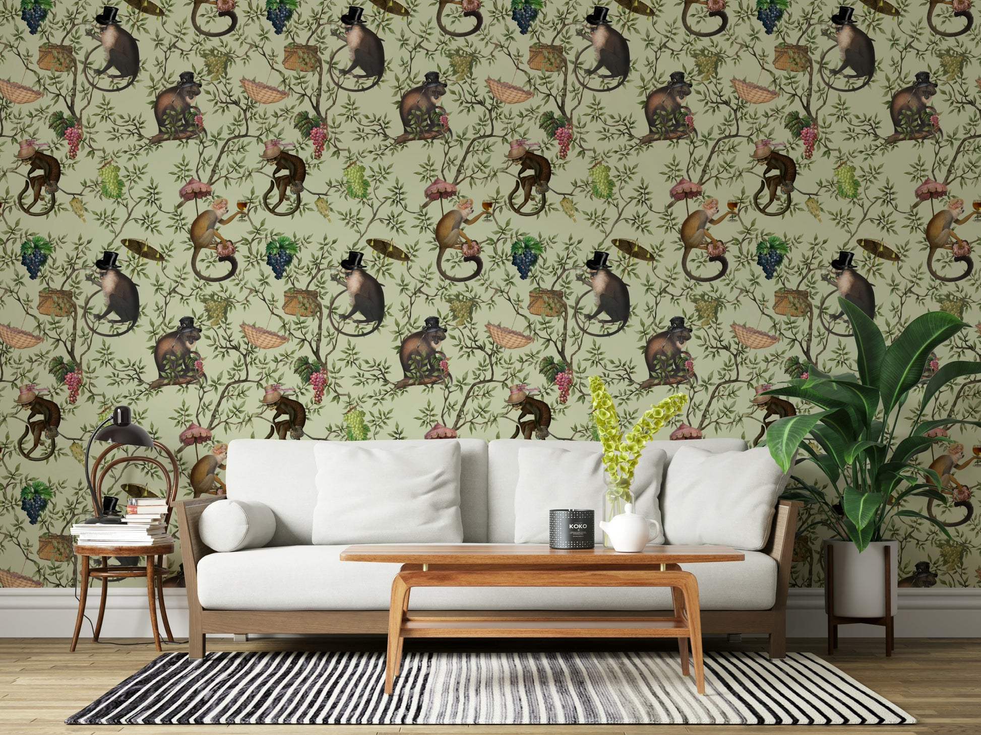 Escape to a world of refined elegance with 'A Primate's Afternoon Tea,' a unique wallpaper design showcasing stylish monkeys enjoying a delightful tea party amidst a picturesque garden setting. The delicate watercolour style brings a touch of vintage charm, with the pastel green background complementing the rich details of the monkeys' attire and the lush greenery. This wallpaper seamlessly blends playful animal motifs with sophisticated decor, creating an ambience that is both whimsical and refined. Ideal for adding a touch of personality to any living space, this design brings an air of sophistication and lightheartedness to any room.