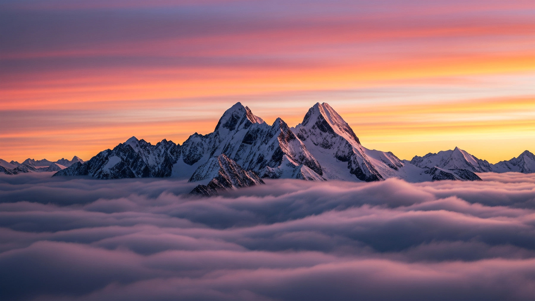 Let this breathtaking mountain vista bring calm to your space. Imagine snow-covered peaks rise above a soft blanket of clouds. A serene sunset paints the sky with gentle pinks, oranges, and purples. This wallpaper for walls makes a striking feature in a bedroom, living room, or home office. The soothing color palette and majestic scenery create a tranquil atmosphere, perfect for relaxation and contemplation. This design helps make interiors feel grand and peaceful.