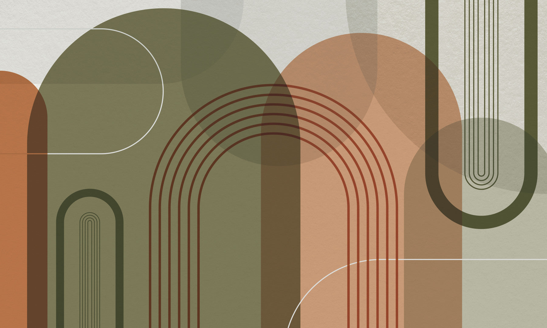 Embrace tranquility with this minimalist wallpaper featuring overlapping abstract arches in calming olive green and warm orange hues. Subtle textural elements add depth to the design, creating a sophisticated and serene atmosphere. The interplay of curved lines and geometric shapes evokes a sense of balance and harmony. Perfect for modern interiors seeking a touch of understated elegance, this wallpaper brings a peaceful and stylish ambiance to any space. The muted color palette promotes relaxation while the dynamic yet balanced composition adds visual interest, making it a versatile choice for various rooms and design styles.