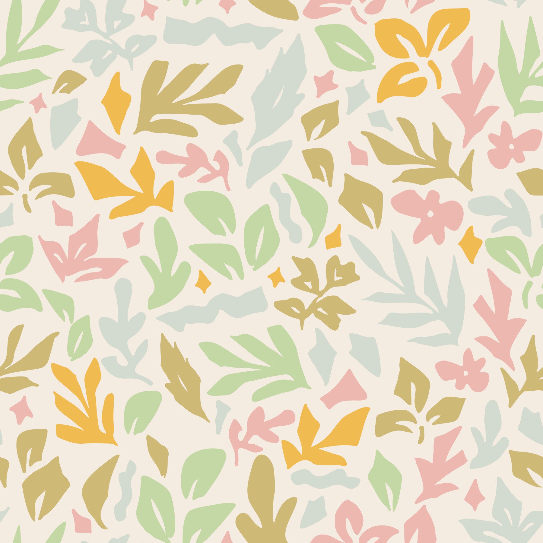 Introduce an organic feel with Bloom Shapes. This wallpaper design displays a collection of artistic flowers in a seamless pattern. Colors blend in an illustrative technique with shades of yellow, pastel pink, and shades of green against a cream background. These gentle colors are fit for wallpaper for walls in spaces like baby nurseries, kids rooms, and calm office spaces. The relaxed design helps to establish balance to the entire room. The minimalist composition makes a statement, adding a playful touch to the interior.