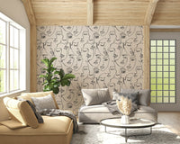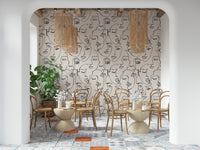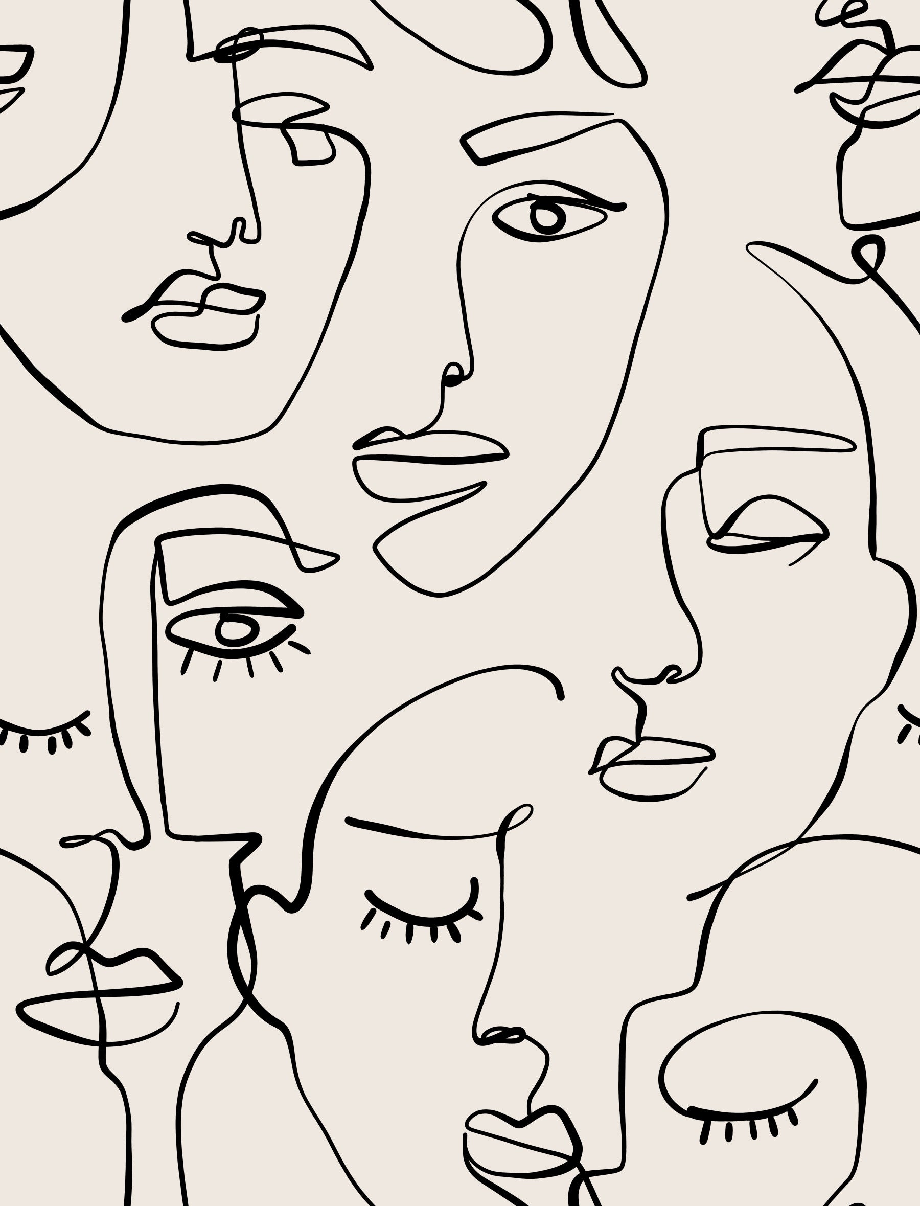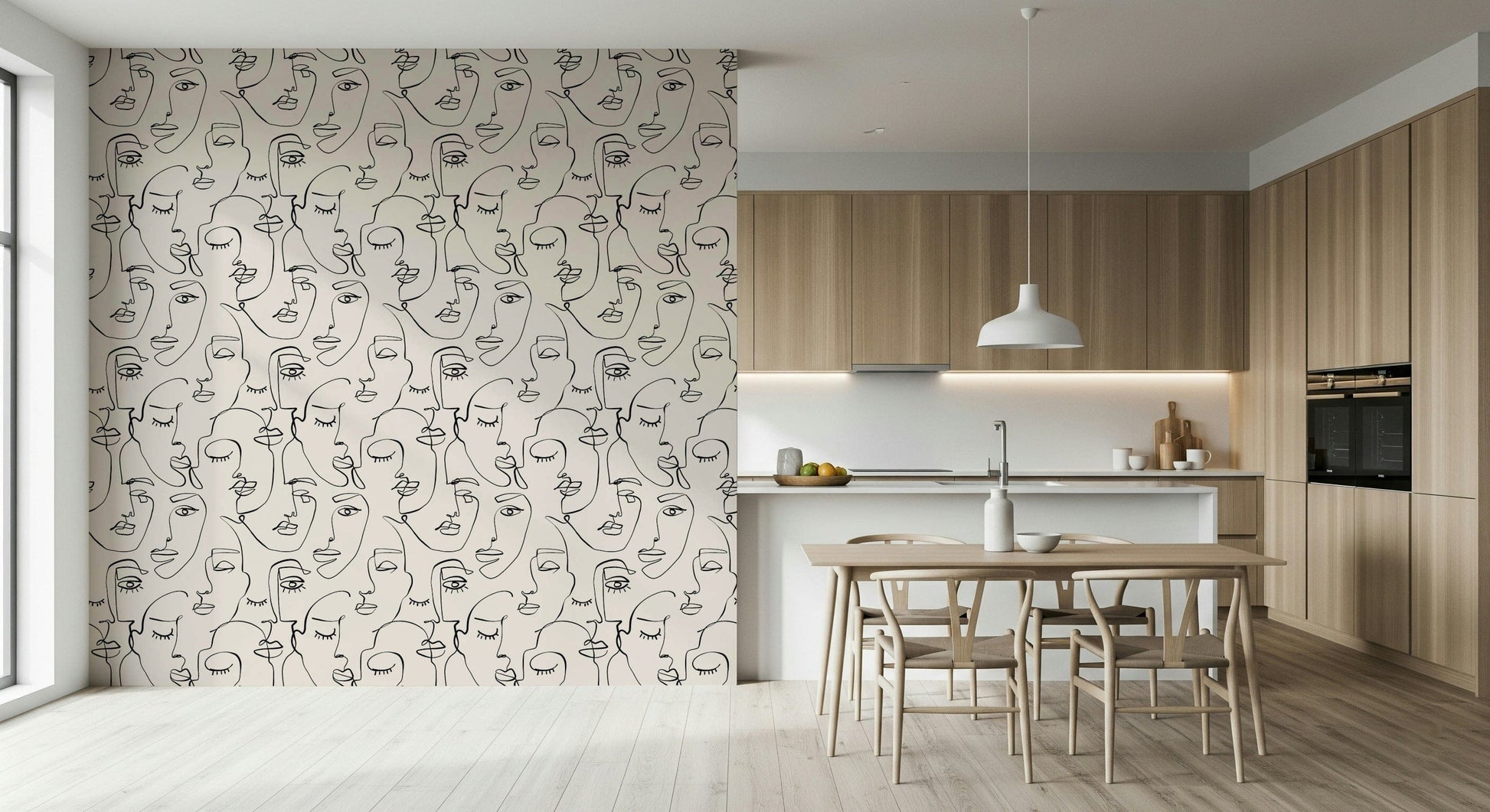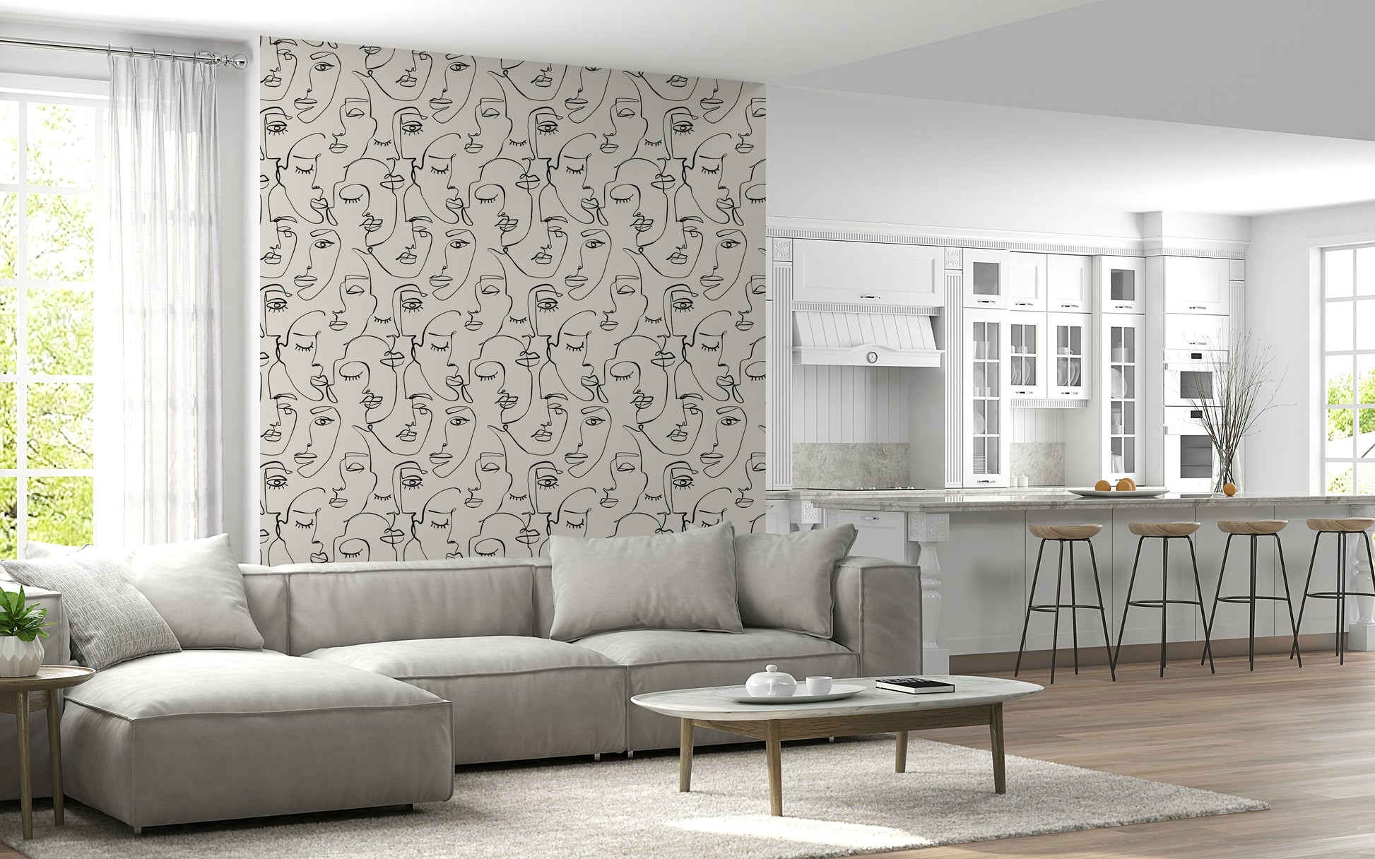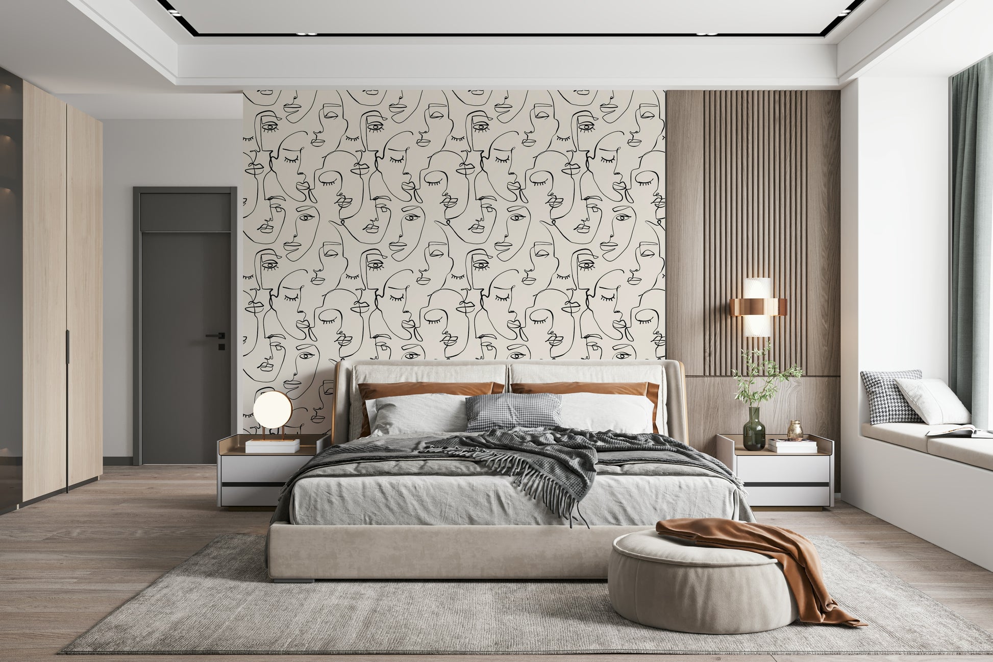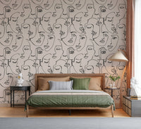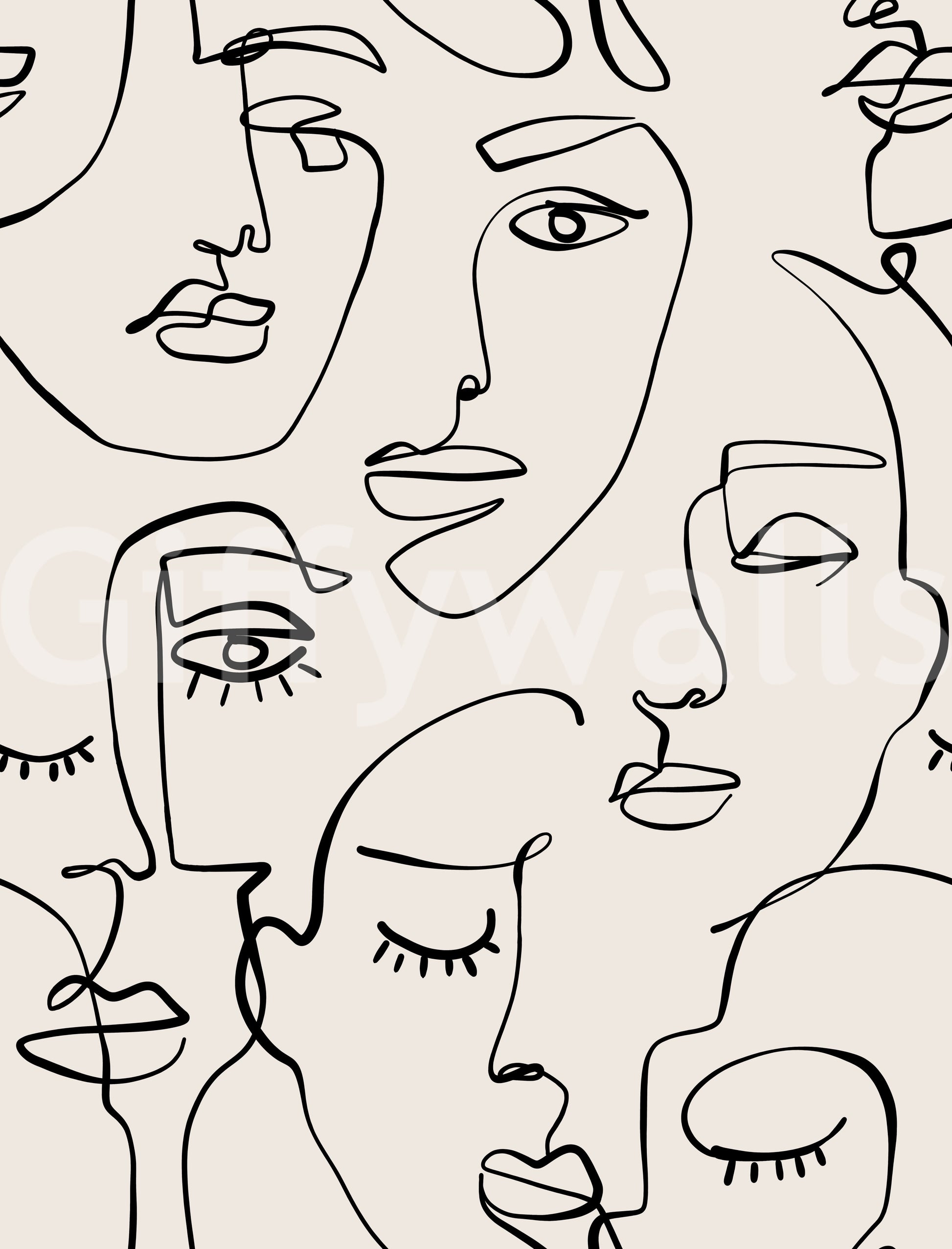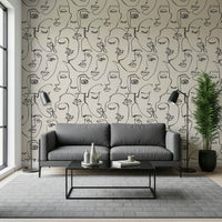 This unique wallpaper enhances your interior with an artistic touch. It features a series of abstract faces created with continuous black lines against a calming beige backdrop. Perfect for a contemporary living room, serene bedroom, or inspiring home office, this wallpaper for walls brings a sophisticated and modern vibe. The minimalist design adds depth to rooms, making it a focal point while complementing other decor elements. Transform your walls into a canvas of modern art.