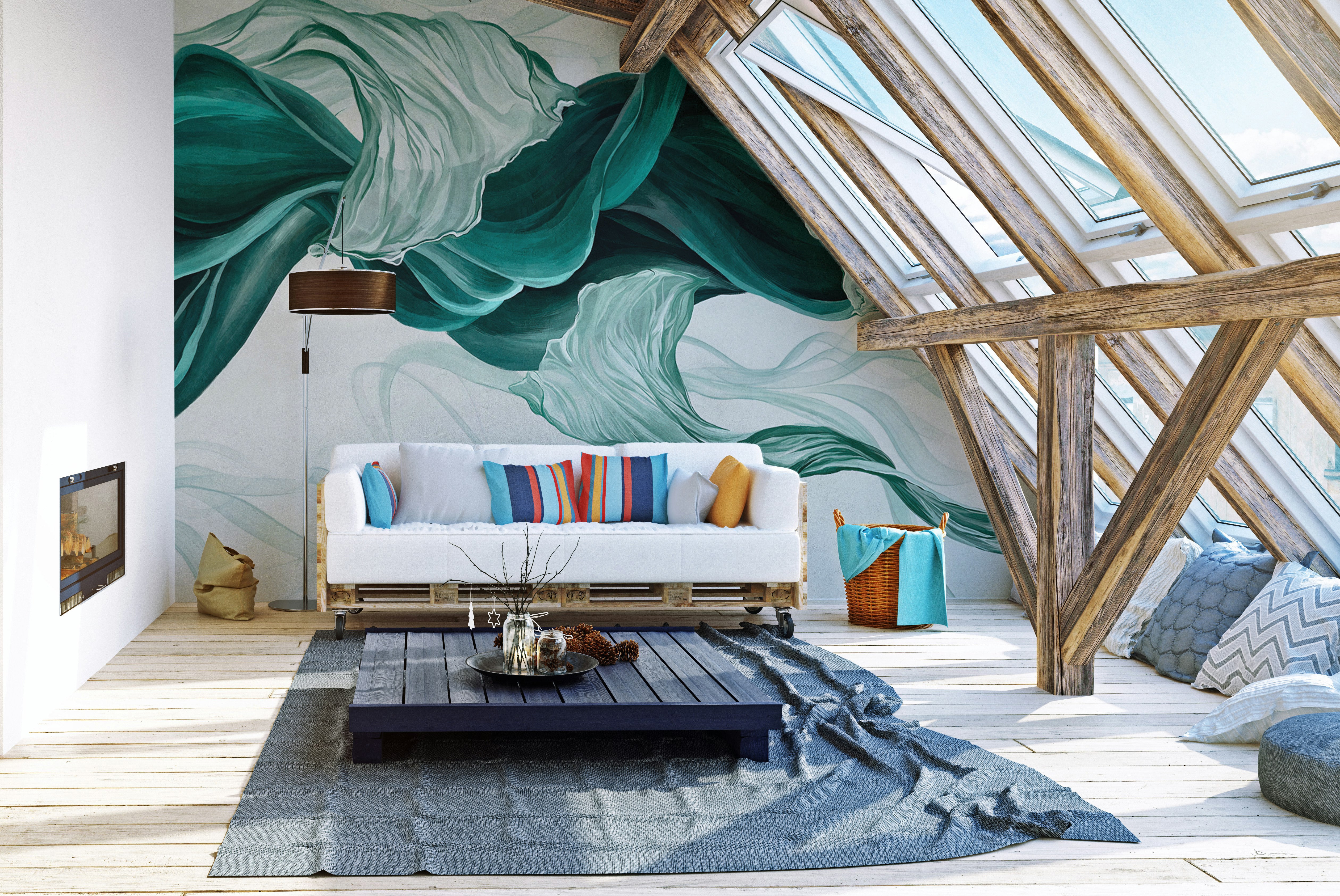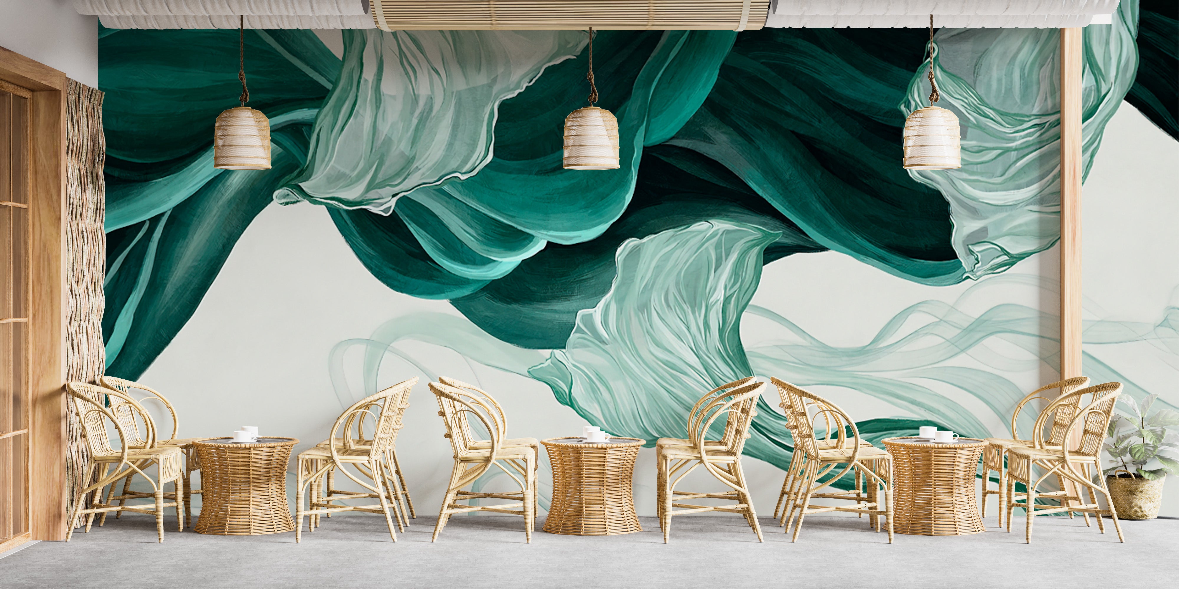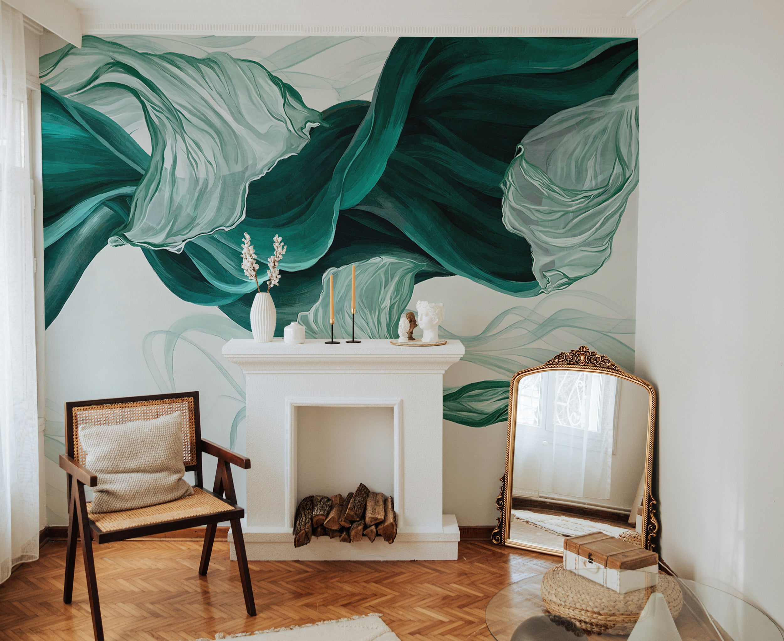 The abstract flowing fabric wall mural is for your room to create a soft, elegant mood with a flow of teal and white fabrics. The smooth-flowing fabric of this mural brings out the sense of lightness it gives your place. It will go well with your modern place: living room, bedroom, or even office. Shop now and enjoy the peaceful effect this abstract mural brings, along with Free Shipping to your doorstep!