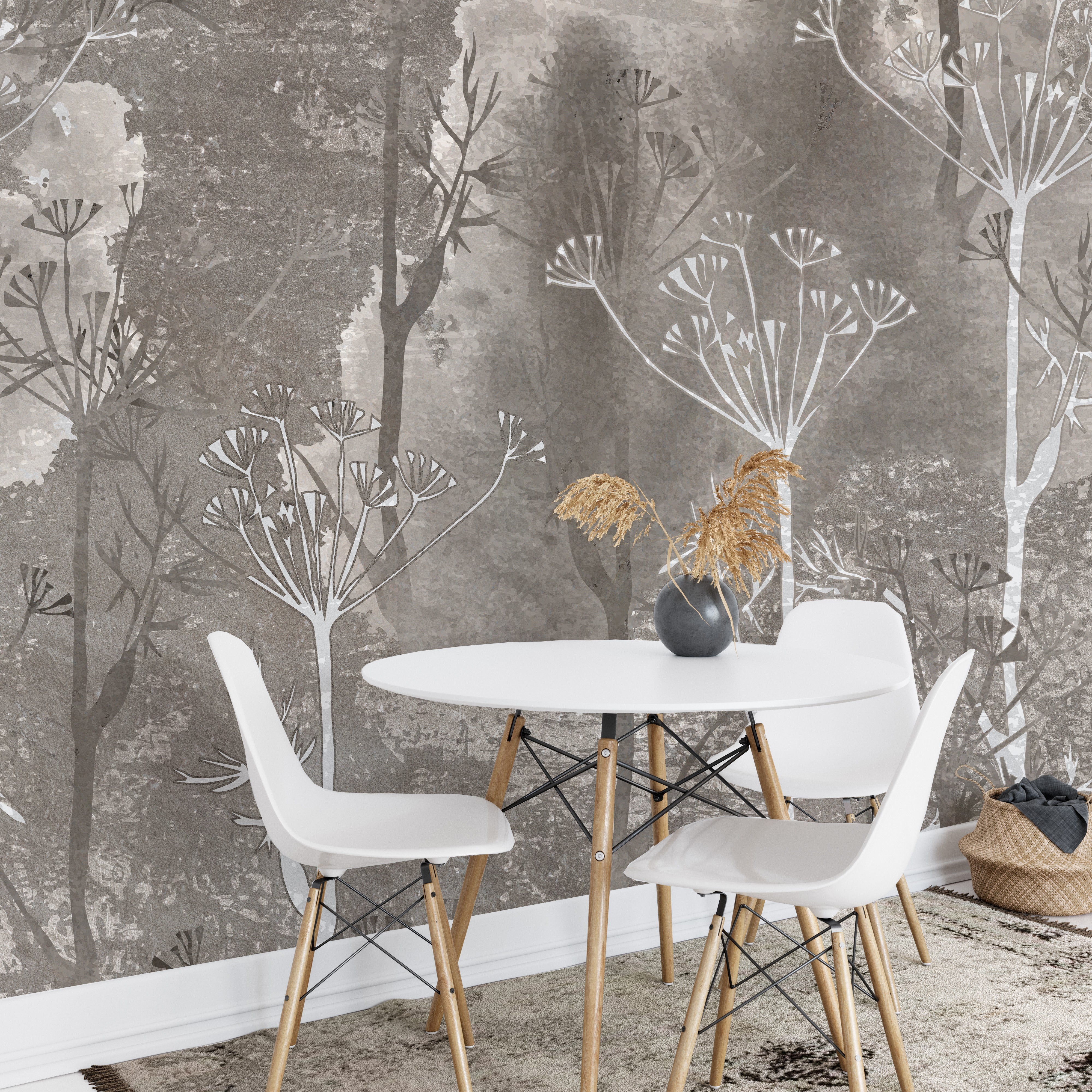 This sepia grey coloured abstract forest trees mural wallpaper is a stunning addition to any living room, blending contemporary aesthetics with the timeless beauty of nature. The mural features a mesmerizing forest scene, portrayed in a unique abstract style that captivates and soothes. The sepia grey tones create a tranquil ambience, perfect for a serene living space. Thewallpaper for wallsdesign brings the essence of the outdoors inside, offering a sophisticated and subtle nod to the natural world. Ideal for those seeking to add a touch of elegance and calm to their living room, this wallpaper harmoniously combines grey and forest themes, making it a versatile choice for various interior styles. Its abstract interpretation of forest trees adds an artistic flair, turning your wall into art.