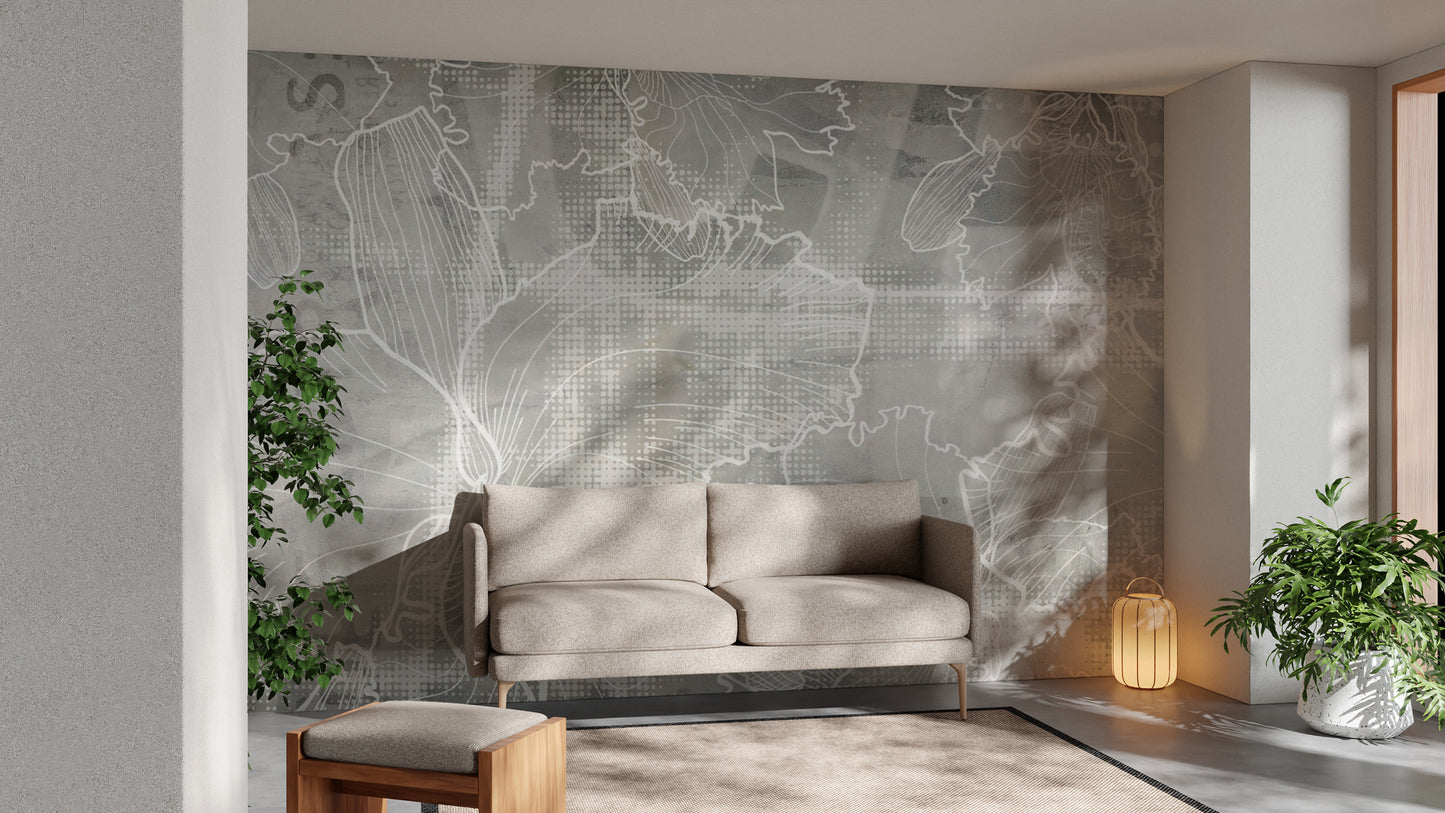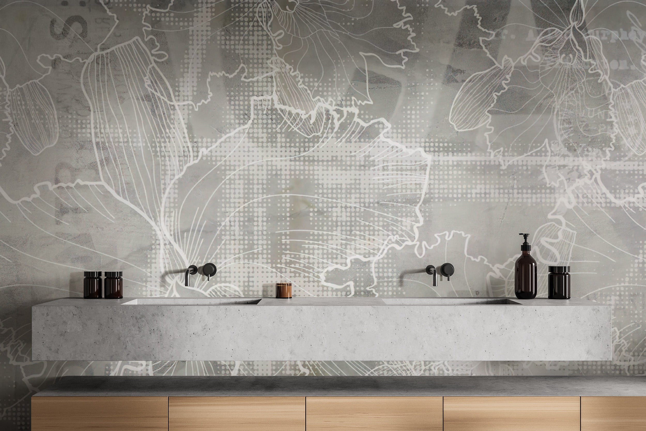 Soft floral outlines on a sleek grayscale wallpaper mural