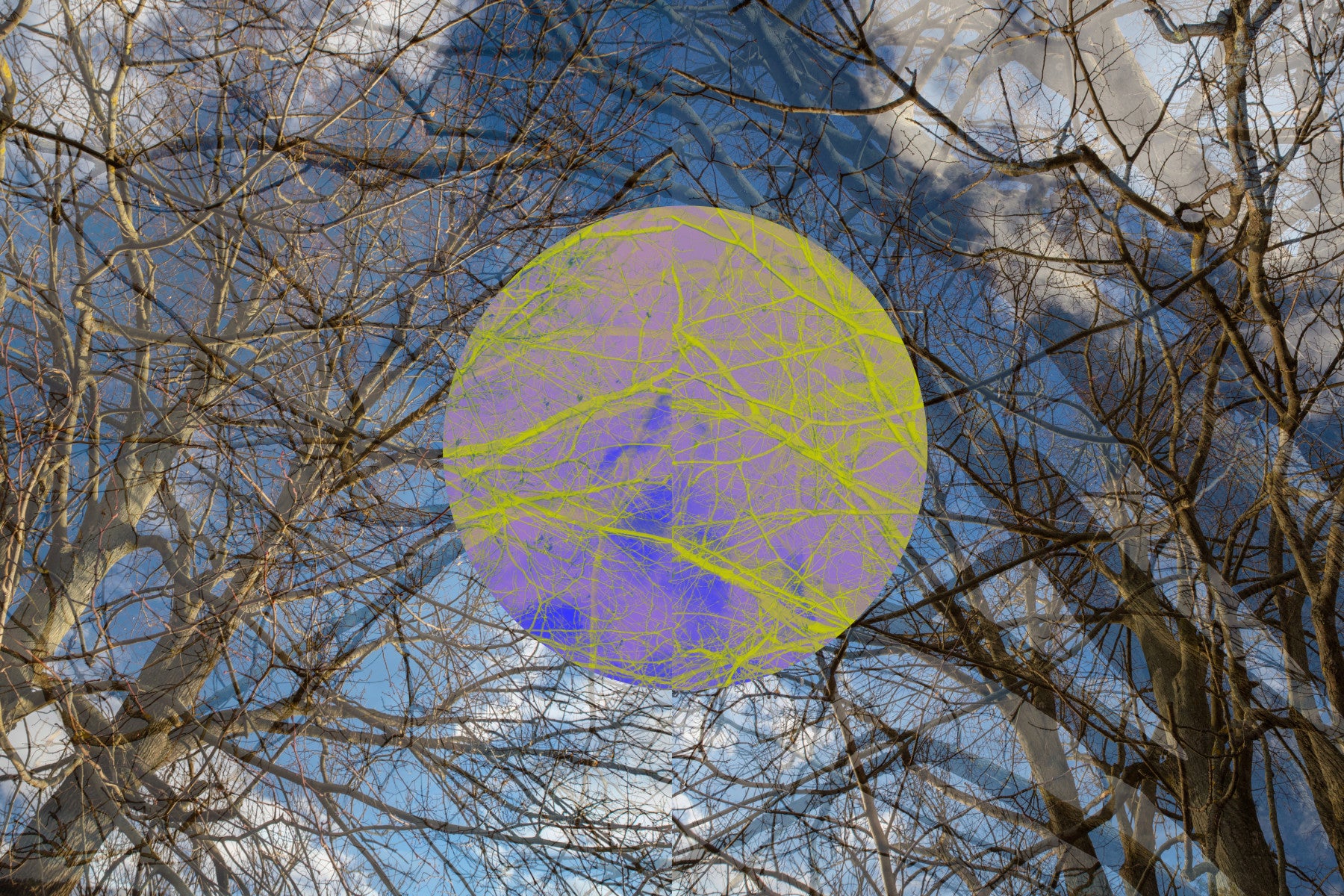This striking artwork presents a unique blend of nature and abstraction, featuring intricate tree branches layered against a vibrant circular overlay. The interplay of colours and patterns invites contemplation, making it a captivating focal point for any room.