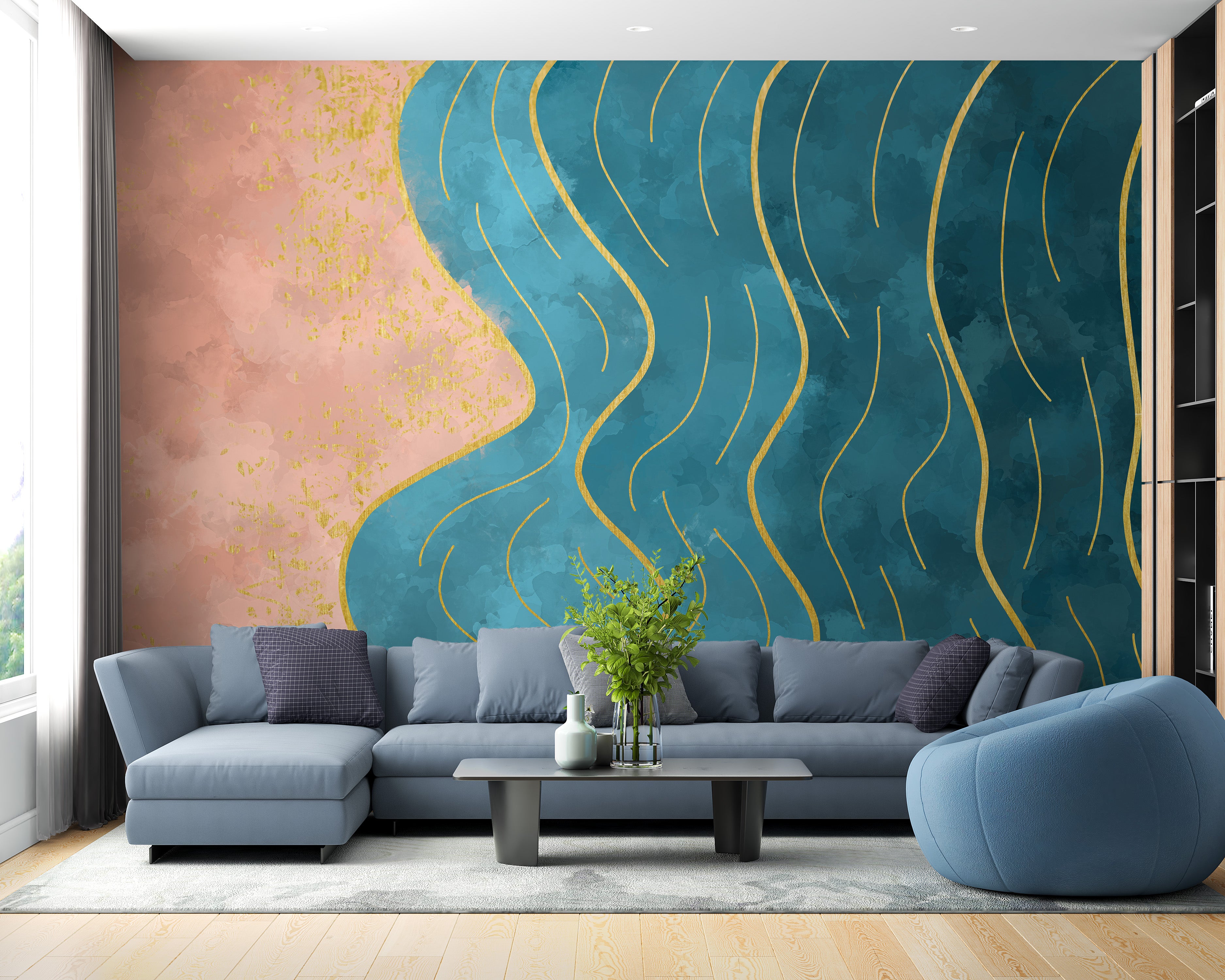 Elevate your walls with the abstract watercolour blue wave gold line mural wallpaper, where artistry meets sophistication. This amazing digital masterpiece boasts a rhythmic blue palette laced with delicate gold striations that mimic the graceful flow of ocean tides. The contrasting pinkish-coral section adds a touch of the ethereal, its distressed texture sprinkled with golden flecks for an opulent finish. Perfect for creating a serene yet luxurious focal point in any room, this abstract wallpaper is more than just decor; it's a statement piece that brings depth and movement to your living space. Experience the dynamic interplay of warm and cool hues and transform your surroundings into a gallery of modern elegance.