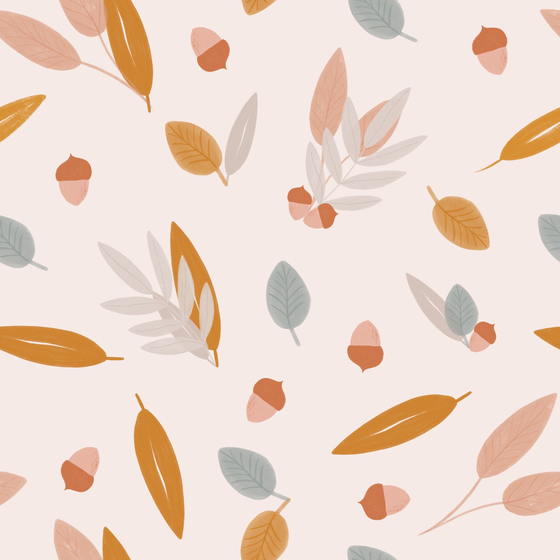 Pastel leaves and golden acorns arranged in a playful yet elegant wallpaper pattern.