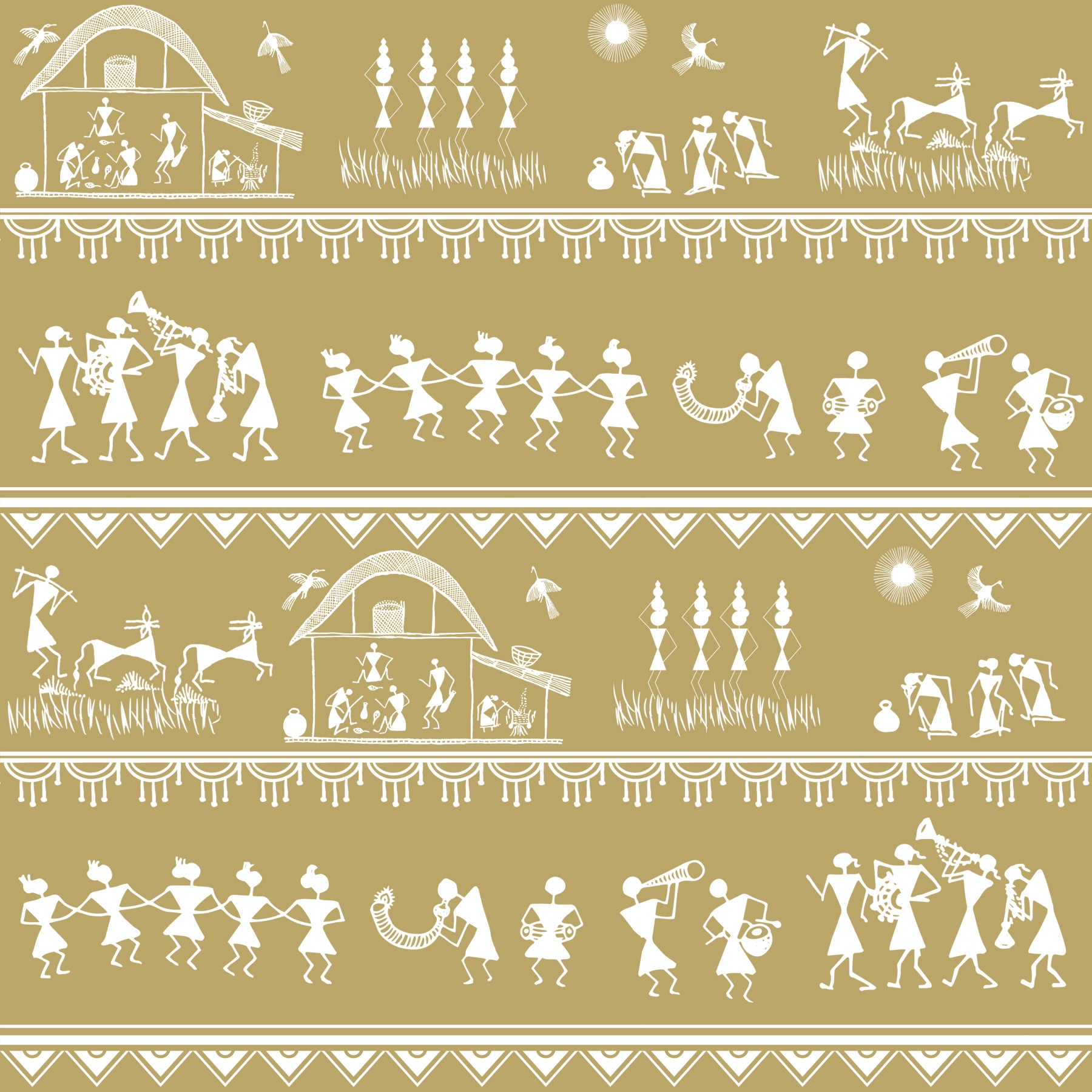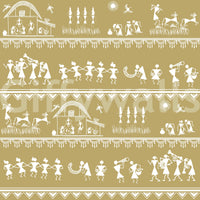 The Adivasi Chronicles Wall Mural presents a visual narrative inspired by indigenous communities of India. The artwork features stylized human figures, village huts, farming scenes, music, and dance, all arranged in rhythmic horizontal panels. Its design reflects the simplicity and storytelling style found in traditional folk art, using balanced patterns and earthy tones.
