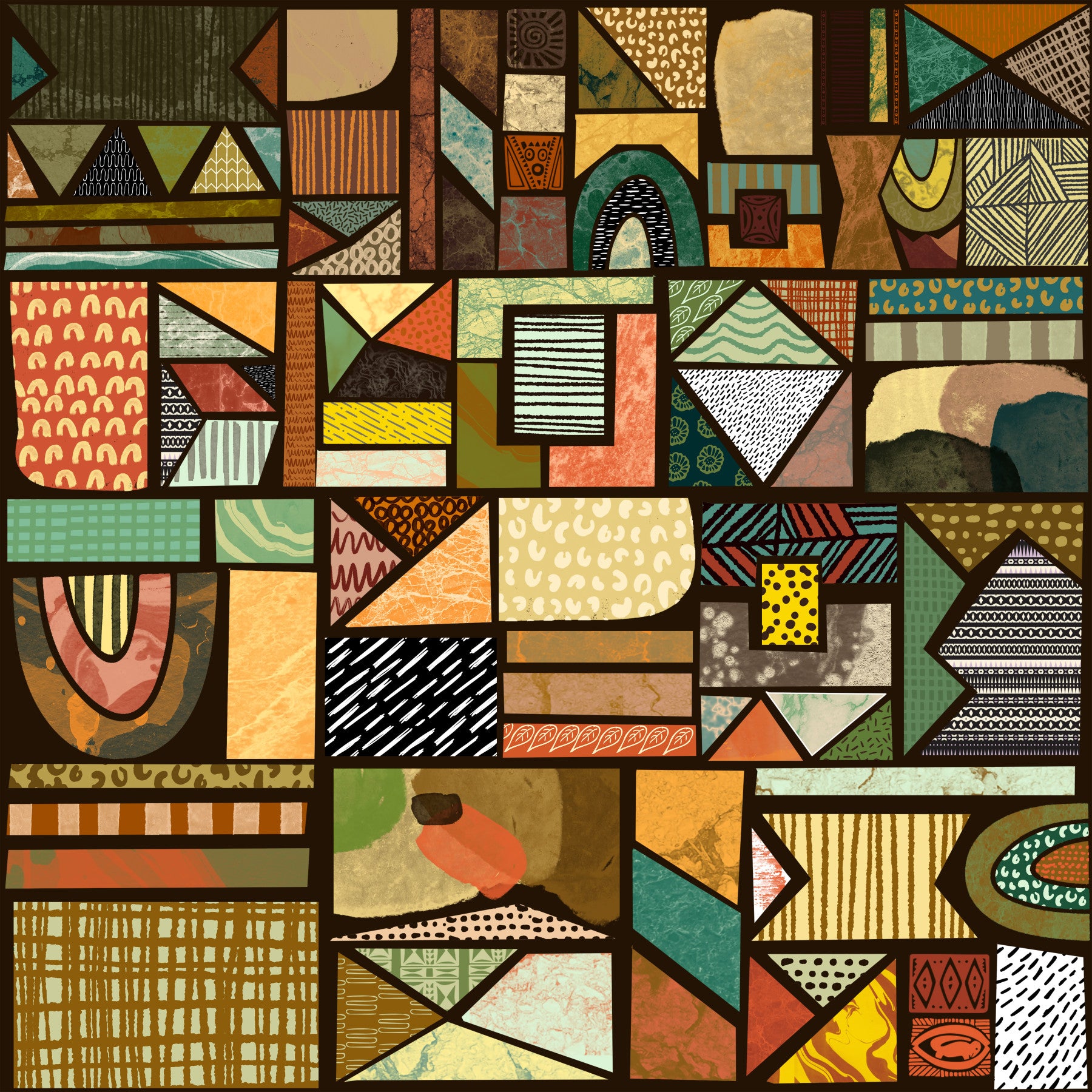 Experience the vibrant spirit of Africa with this captivating wallpaper. A rich tapestry of geometric shapes and hand-drawn patterns intertwines, echoing the diverse textures and traditions of the continent. Earthy tones of ochre, terracotta, and deep greens dominate, punctuated by pops of brighter hues. The collage-like composition feels both modern and ancient, reflecting the blend of old and new found in Africa's culture. This wallpaper is a celebration of African artistry, its bold visuals and earthy palette creating a mood of warm energy and sophisticated style.