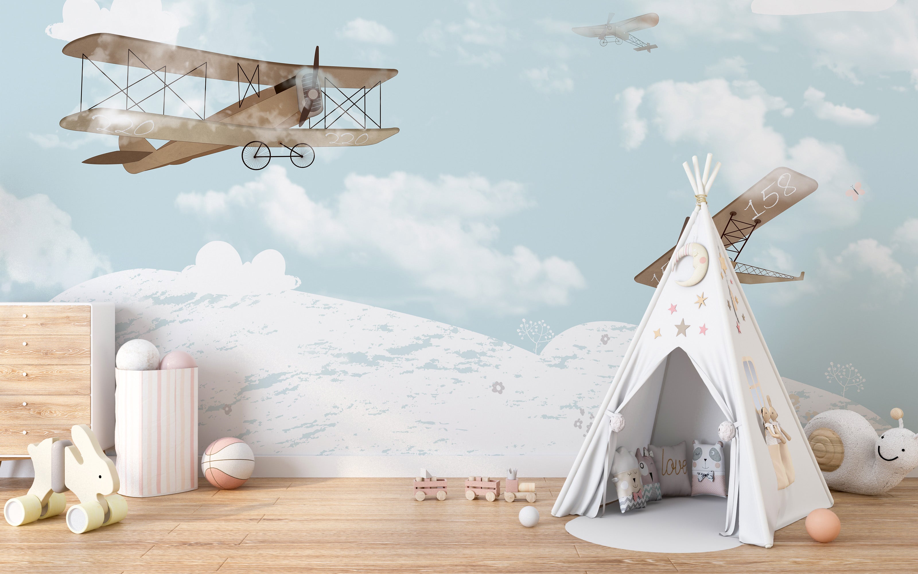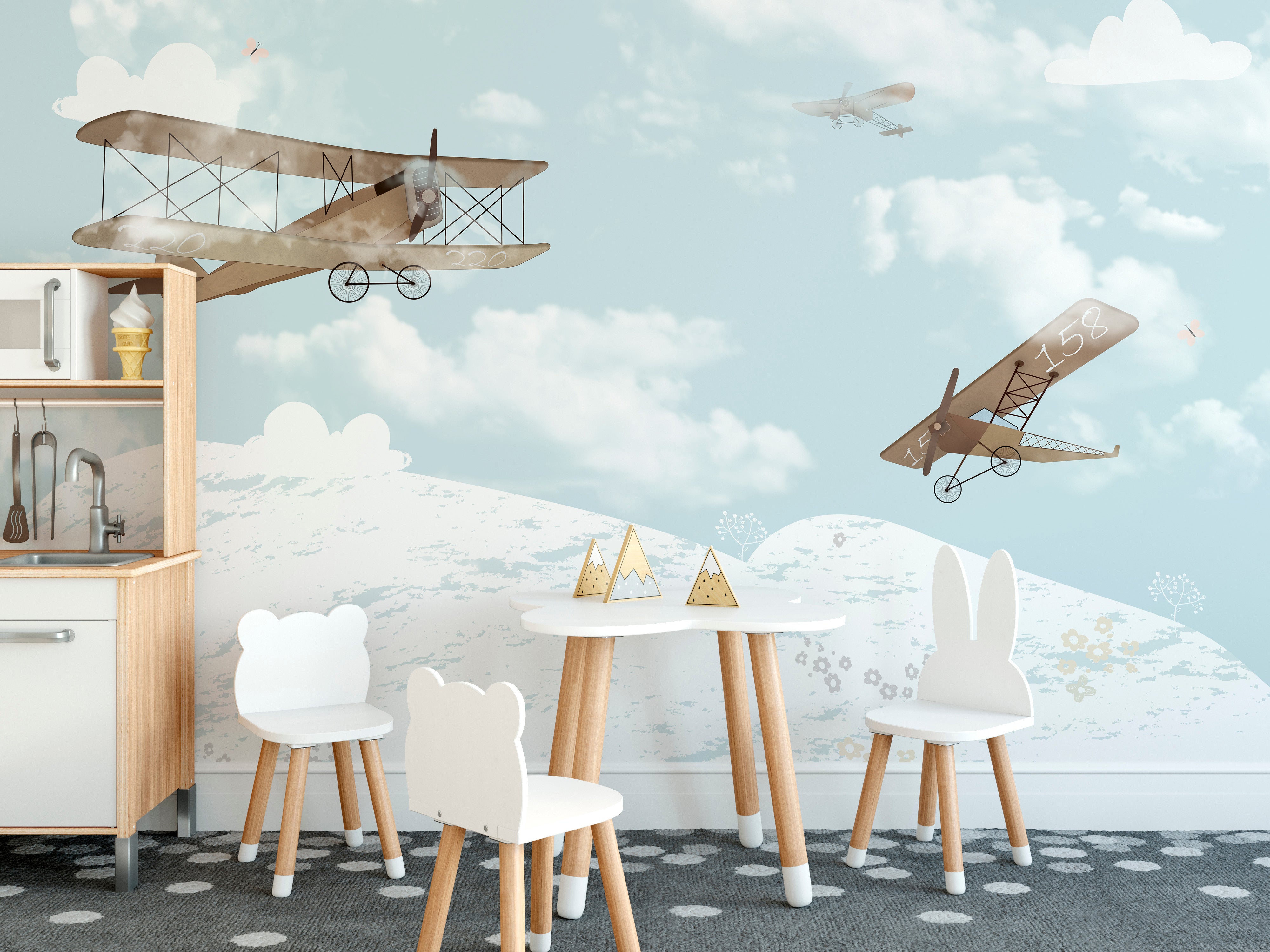 Imagination is the limit when creating a fun and imaginative space for your little ones. A biplane in the sky mural wallpaper can help transform any dull and uninviting kids' room into a fascinating space filled with wonder and adventure. With its bright and vibrant colors, your children will feel like they are soaring high in the sky, exploring new and exciting places daily. This playroom wallpaper not only captures your child's imagination but also adds a touch of creativity and fun to the decor. So why stick to a dull and conventionalbedroomwhen you can add a touch of whimsy to your child's playtime and make their space unique?