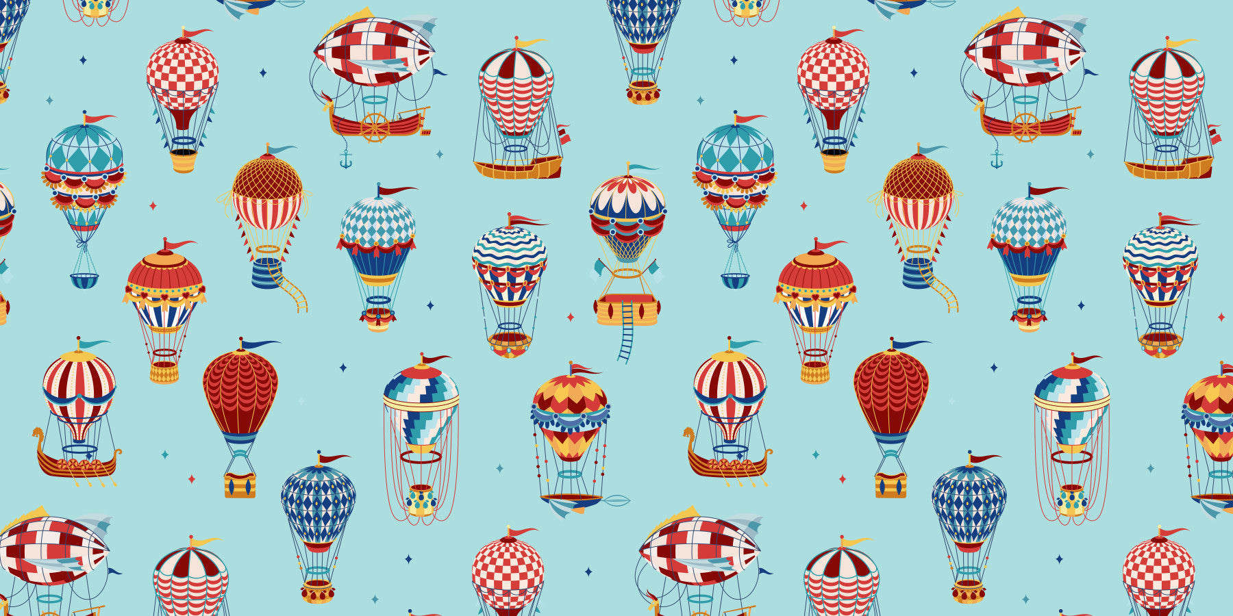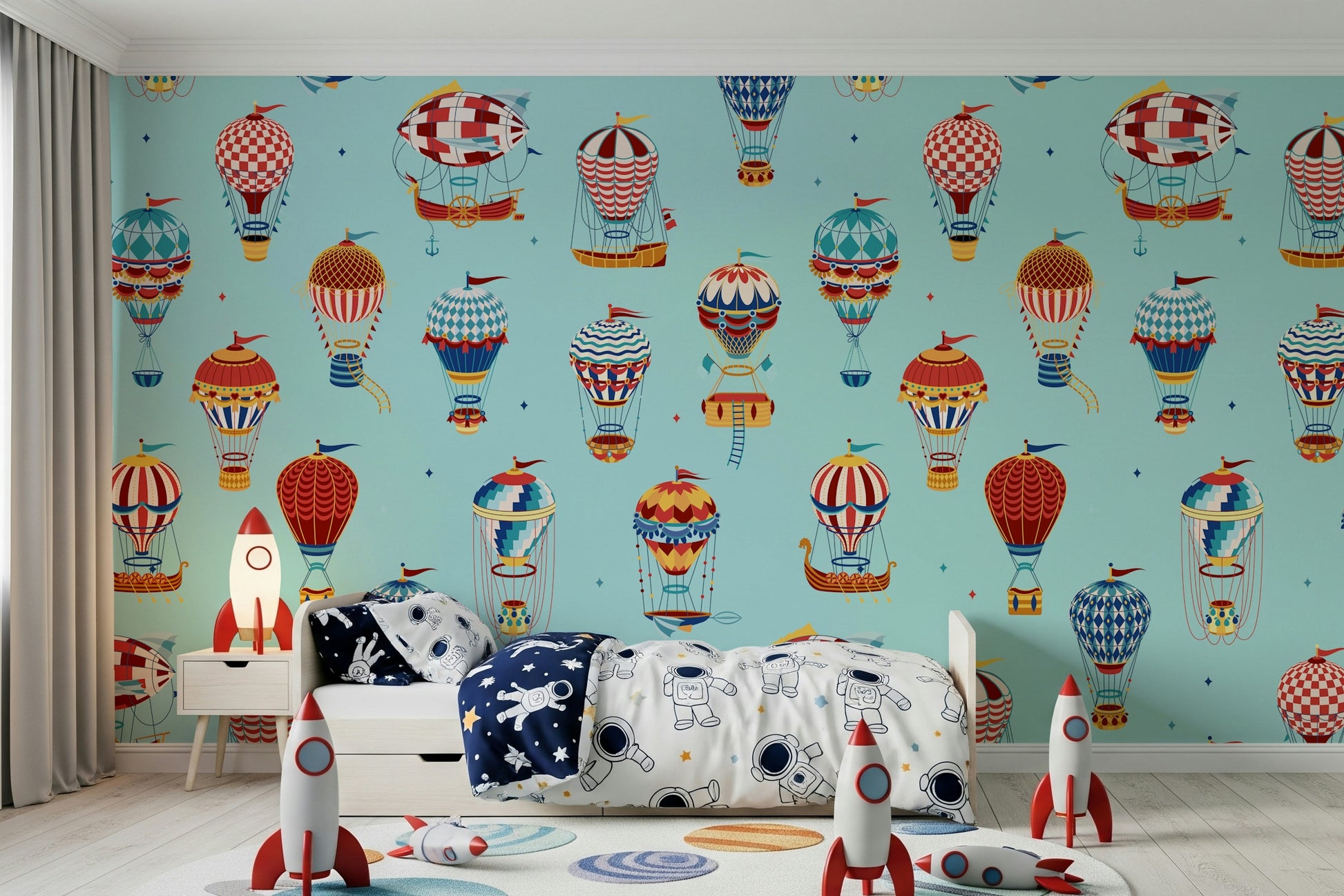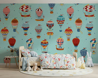 Take flight with this whimsical wallpaper for walls, featuring a colourful pattern of vintage hot air balloons. This fun design comes to life with shades of red, blue, and yellow against a sky-blue backdrop. It's perfect for a kid's room or playroom, sparking imagination and adding a touch of adventure. The playful style complements modern interiors and brings a sense of joy to any space.