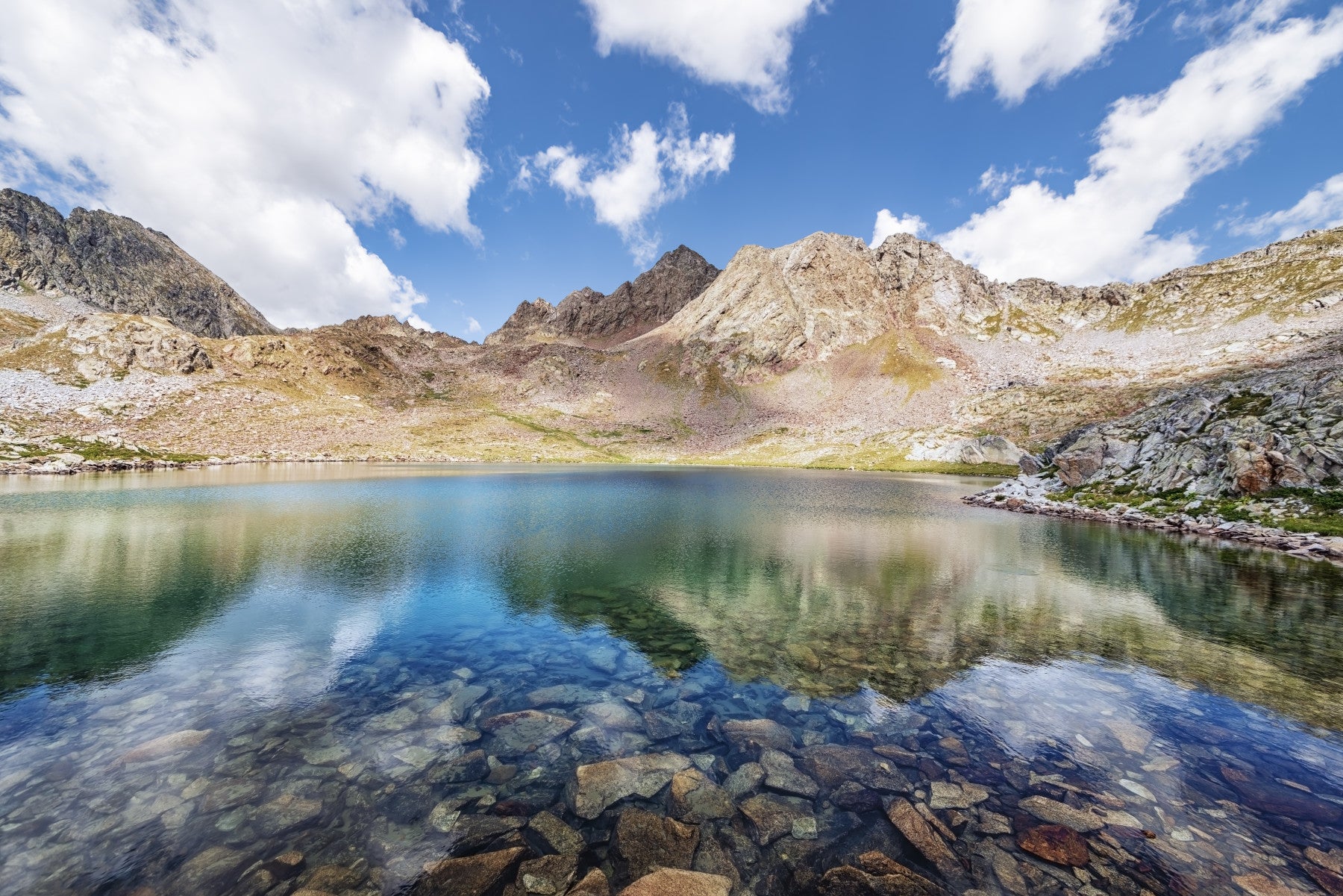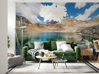 Bring the serene beauty of an alpine lake into your home with this stunning wallpaper for walls. The design showcases majestic mountains mirrored in the pristine, blue waters, complete with visible rocks below the surface. Earthy browns and vibrant blues create a peaceful and inviting atmosphere in any room. Ideal for living rooms, bedrooms, or home offices, this wallpaper offers a captivating view that promotes relaxation and a connection to nature. Transform your interior with the clear, calming essence of a secluded mountain paradise.