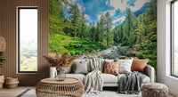 Transform your living space with this serene mountain stream wallpaper for walls. The crisp, clear water rushes over smooth stones, nestled between lush greenery and towering pines. The design's colour palette emphasises deep greens and blues, complemented by natural browns and greys. This wallpaper will bring a peaceful, outdoor feel into any room. Ideal for creating a calming atmosphere in a bedroom or refreshing ambiance in a living room, this image enhances natural light and provides a focal point that enlivens and complements your interior design.