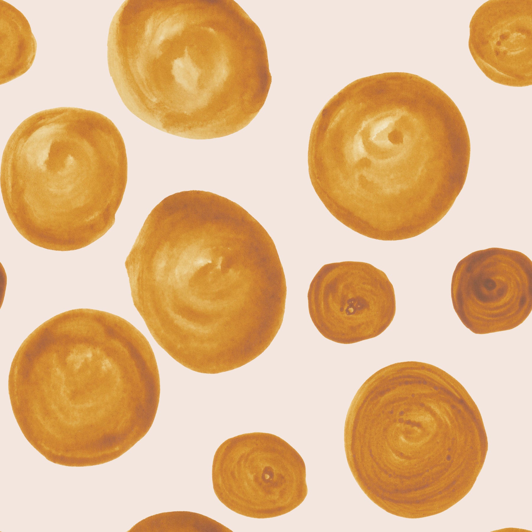 Bring warmth to your walls with this amber circle pattern. The design has a handmade feel. Watercolour brushstrokes form soft, organic shapes. It has neutral tones. The circles dance across a pale background, creating a modern, minimalist look. This wallpaper for walls suits living rooms, bedrooms, or dining rooms. It complements Scandinavian, minimalist, and boho interiors with its simple charm.