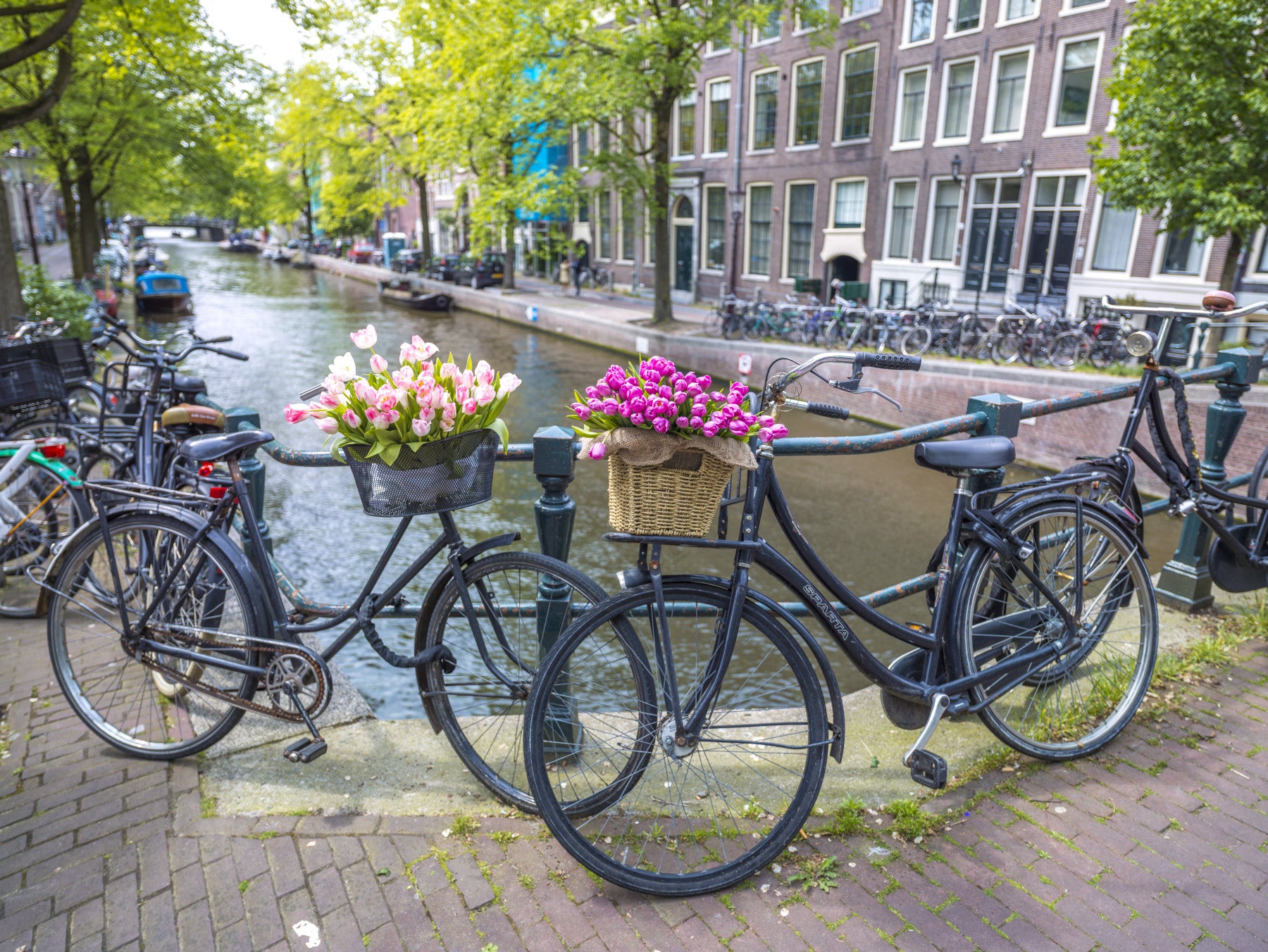 Spring flowers mural bicycle foreground quaint Amsterdam backdrop.