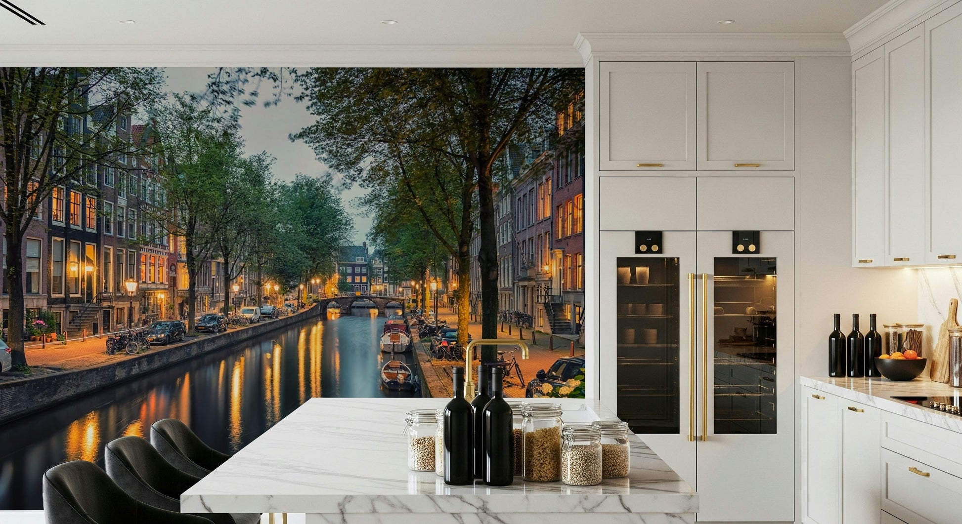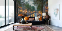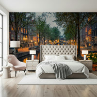 Transform any room with this evocative Amsterdam canal wallpaper for walls. The soft, ambient light reflecting on the water creates a sense of peaceful urban beauty. The architecture of the canal houses, lined by trees, adds depth and character. Golden light from the windows creates a warm glow against the dusky sky. This elegant design suits living rooms, dining areas, or hallways seeking a touch of European charm. The muted colour palette and detailed rendering enrich interior spaces, generating an inviting atmosphere. Perfect for adding a sophisticated, calming focal point to your home.