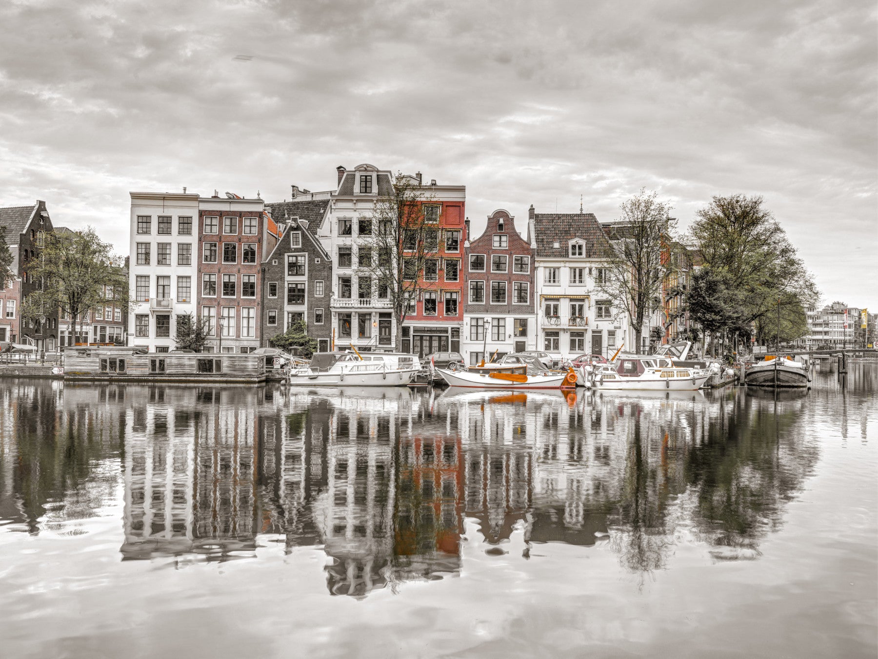 Adorn your home with the iconic charm of our Amsterdam Reflections Wall Mural. This captivating mural wallpaper features a picturesque canal scene, showcasing the distinctive narrow townhouses with their beautiful reflections shimmering on the water. While primarily monochromatic, hints of color on the buildings, like the striking red, make the scene pop with life. It's an ideal wallpaper for walls to introduce unique character and sophisticated allure to any room. Its detailed architecture and serene reflections offer a compelling backdrop, ensuring your home feels both vibrant and beautifully connected to the classic European city.